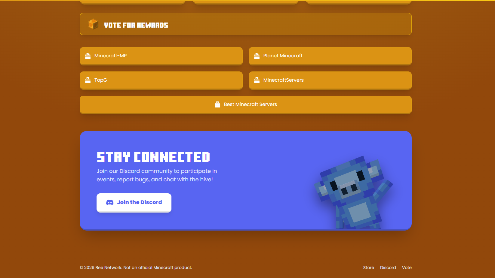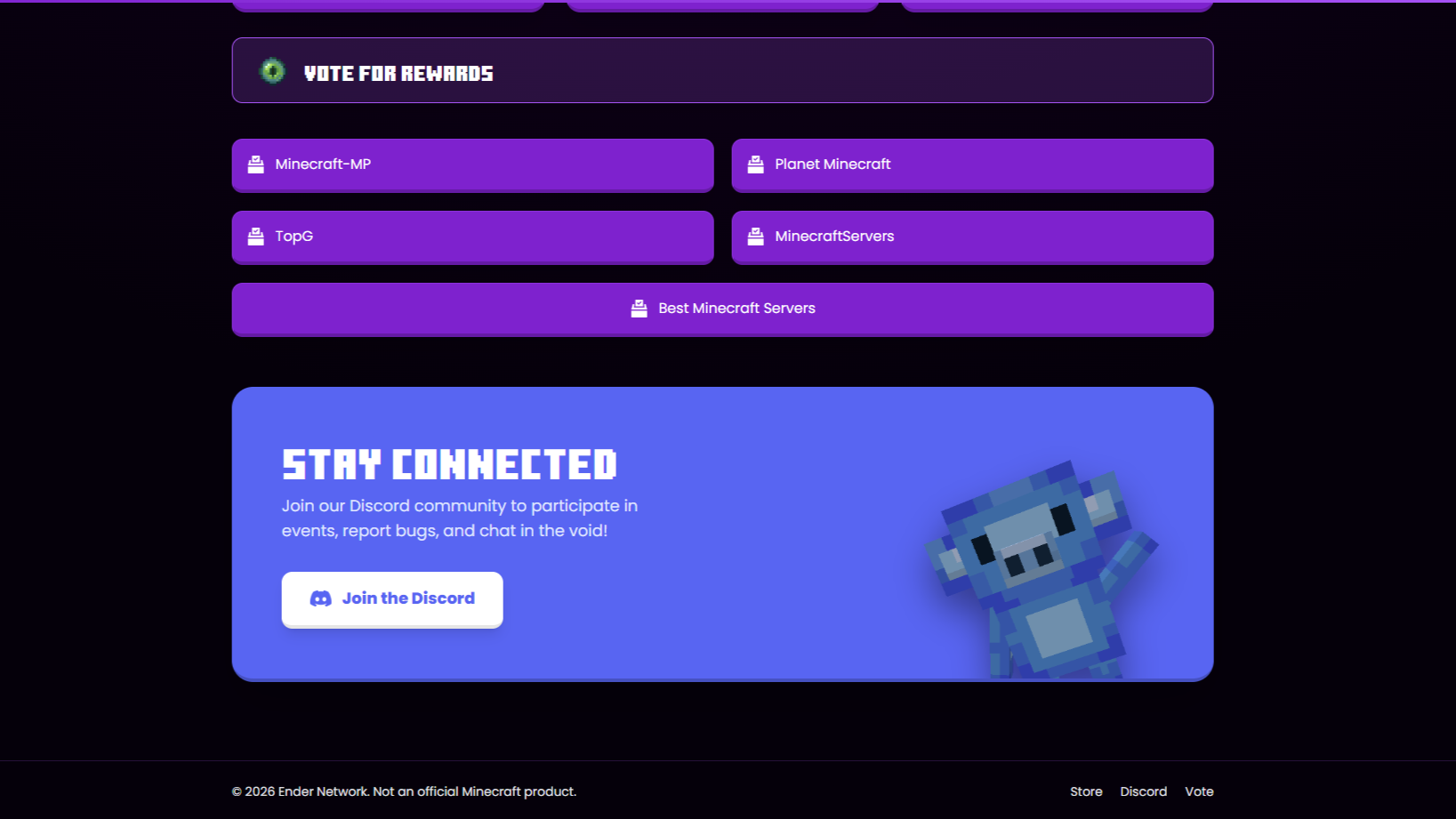 - Store & Discord Buttons: High-visibility buttons to drive revenue and community growth.