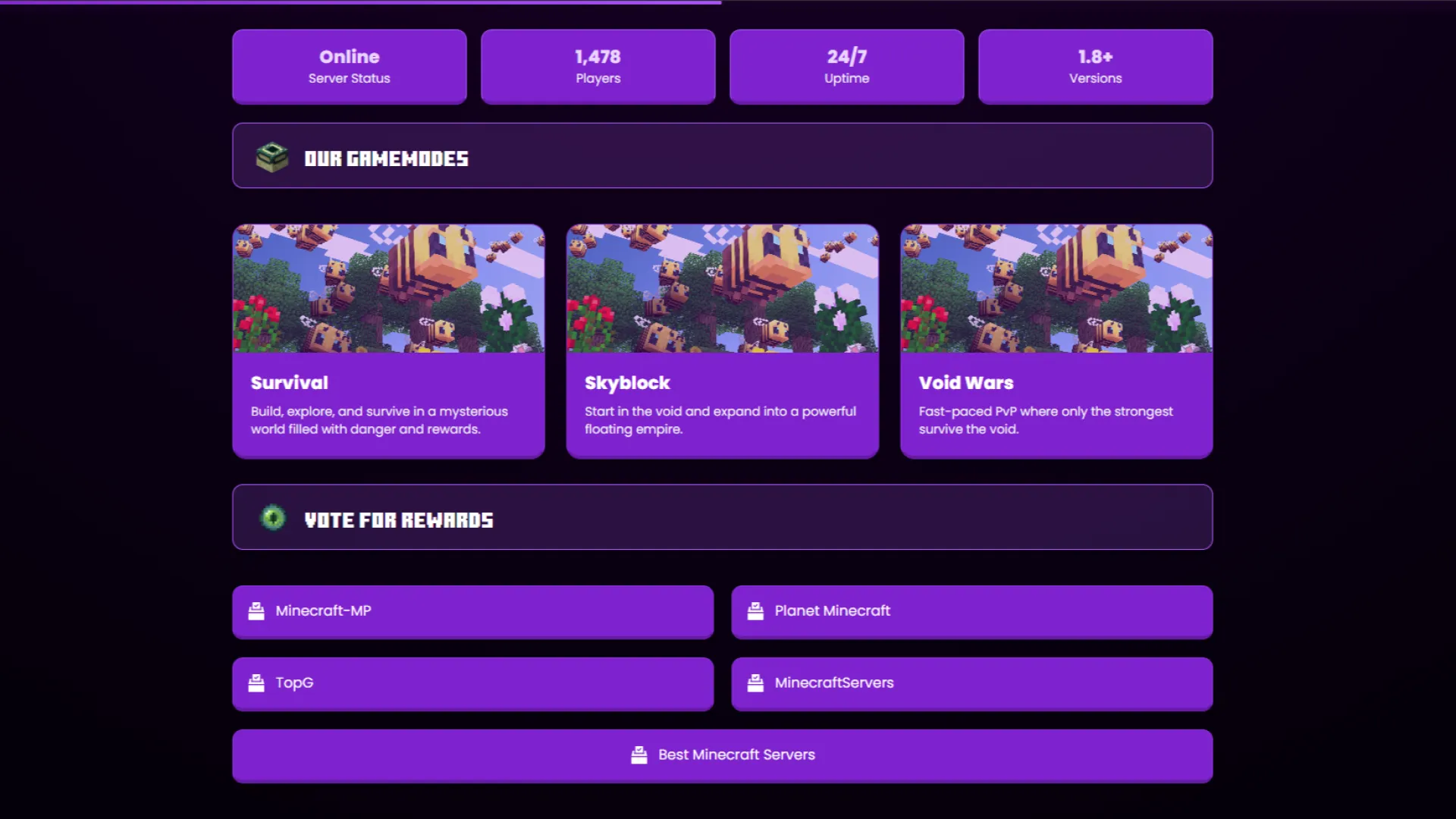 - Clean Hero Section: Features a high-conversion "Copy IP" button to get players in-game faster.