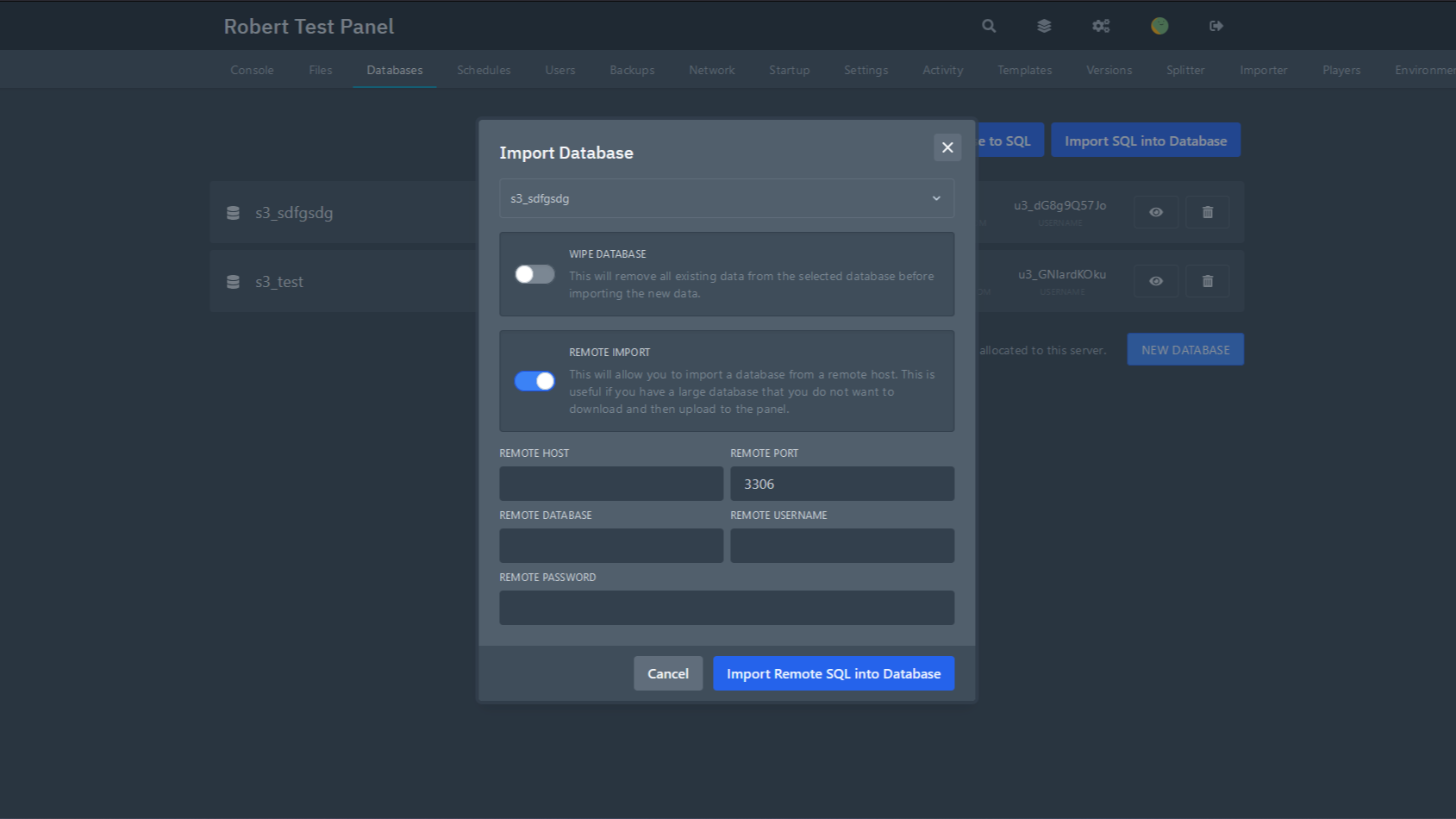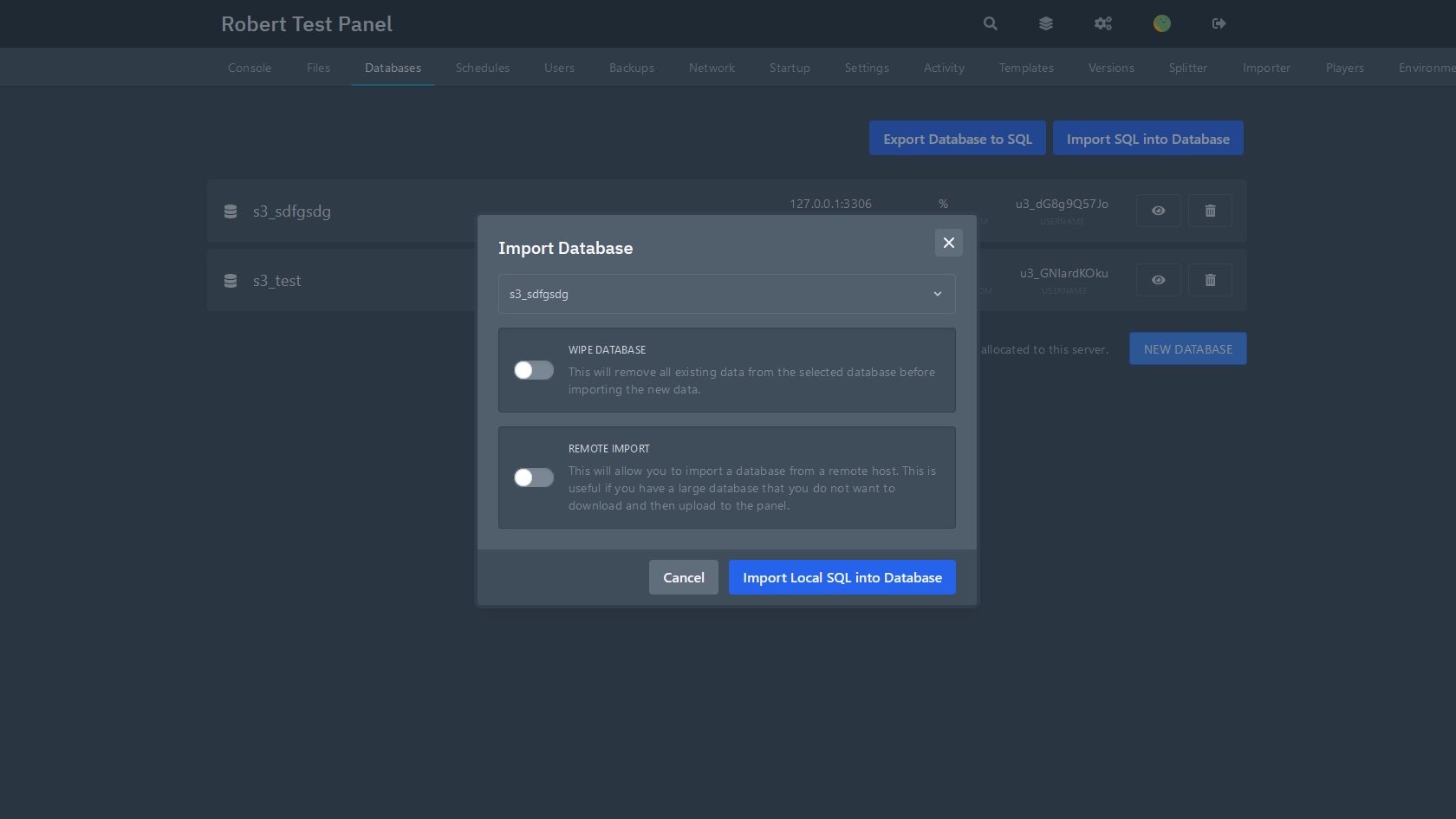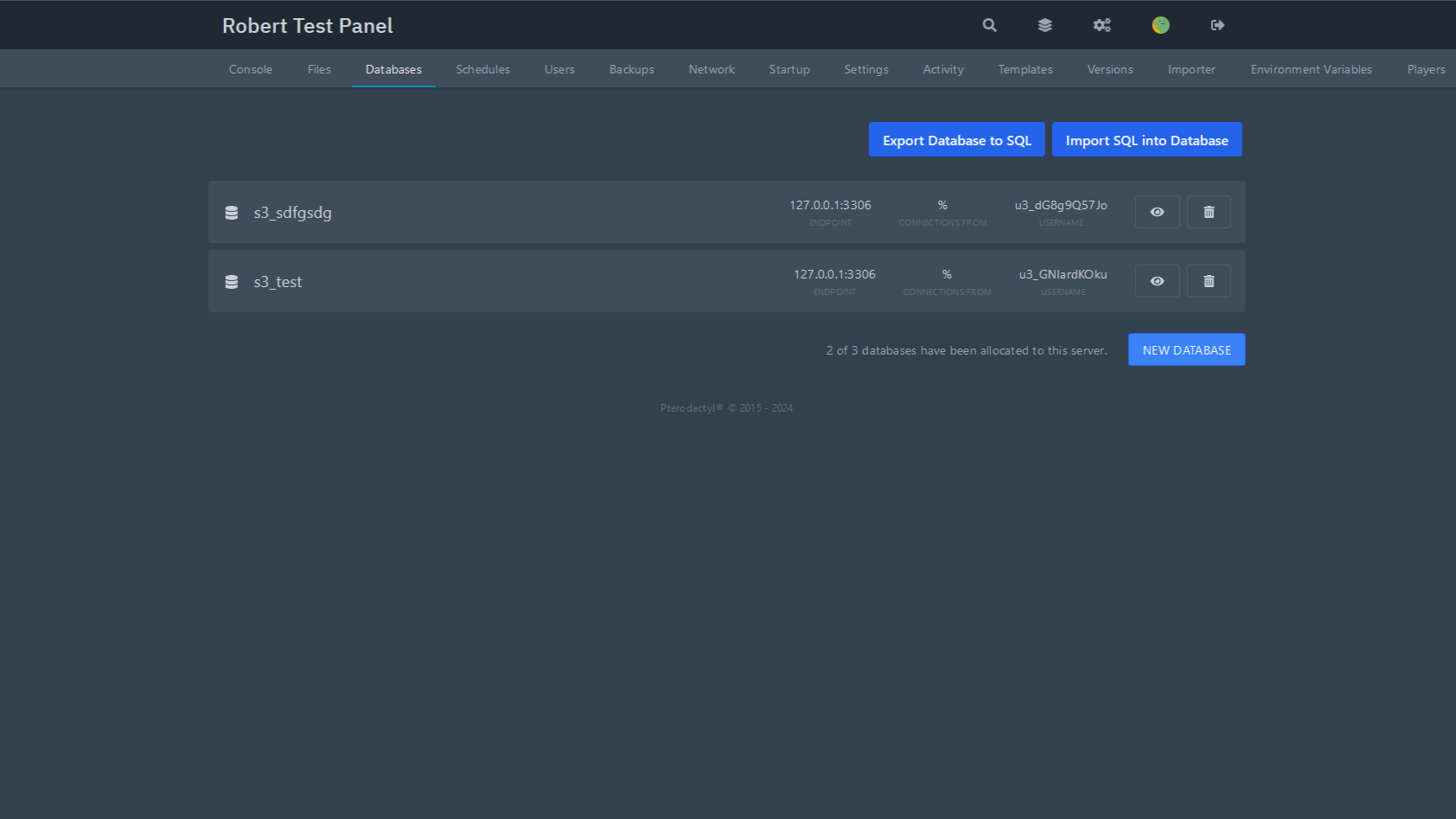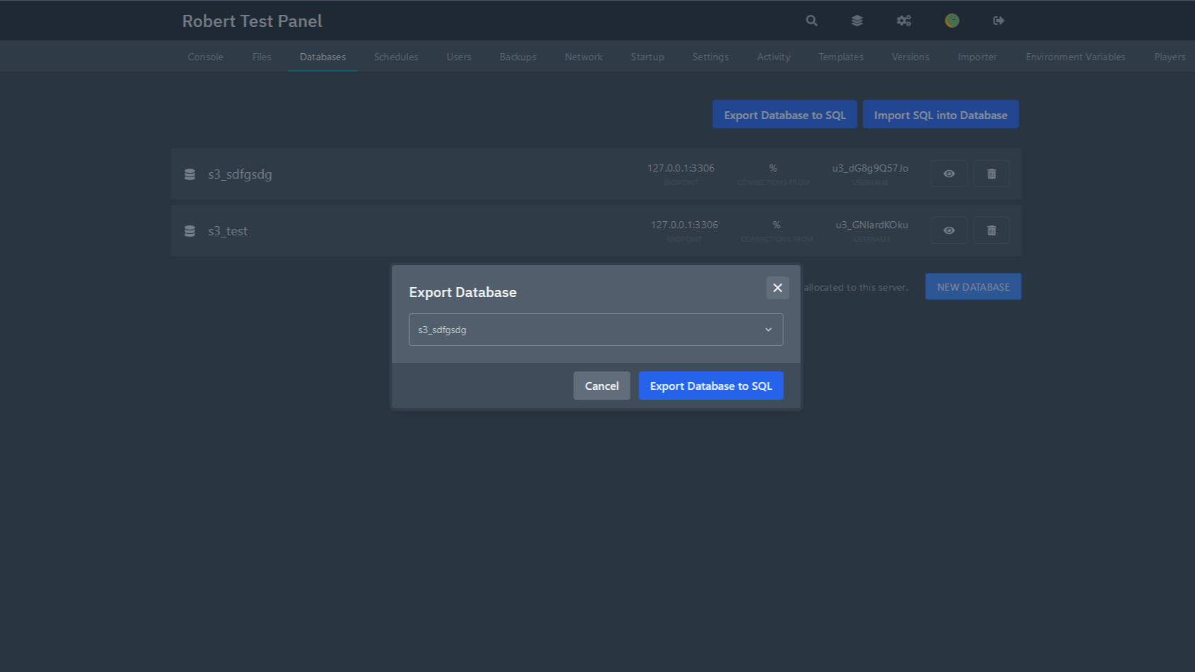 This extension adds the ability to export and import databases from your pterodactyl panel gui easily.