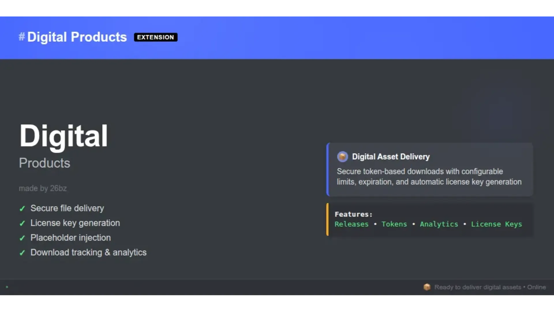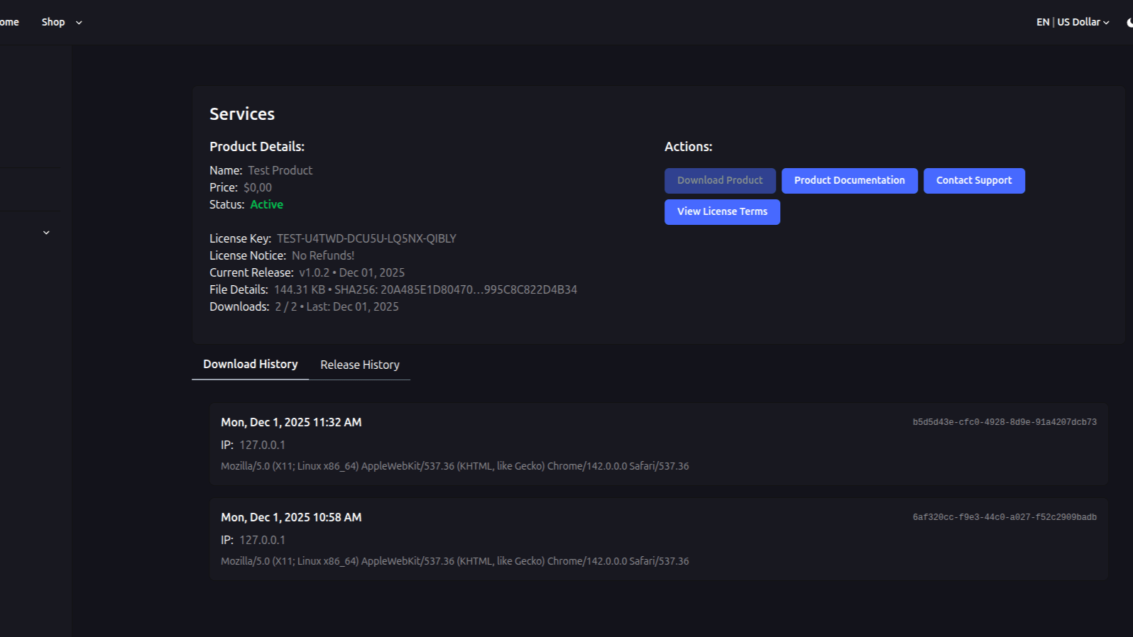 - Signed download links that respect configurable TTLs, per-product rate limits, and audit-IP enforcement.