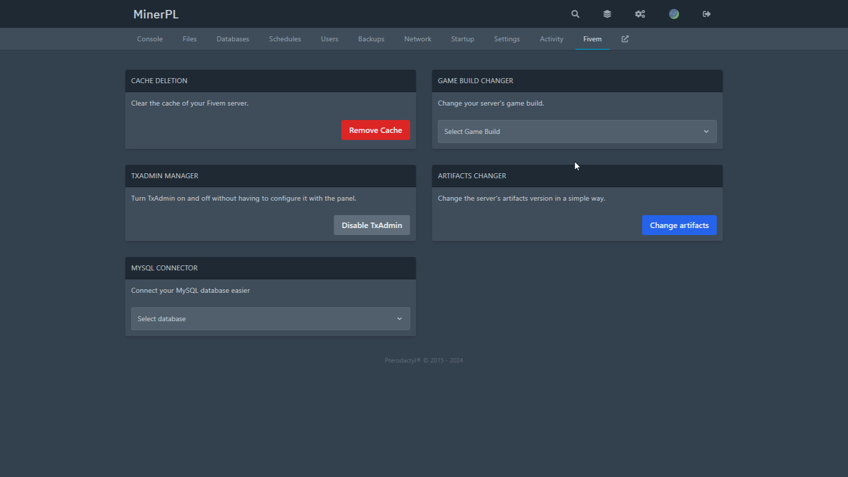 A simple addon adding basic actions for FiveM servers like clearing cache, changing gamebuild, running TxAdmin (with automatic setting of correct allocation as well as file paths), changing version of Artifacts and correct linking database in config.