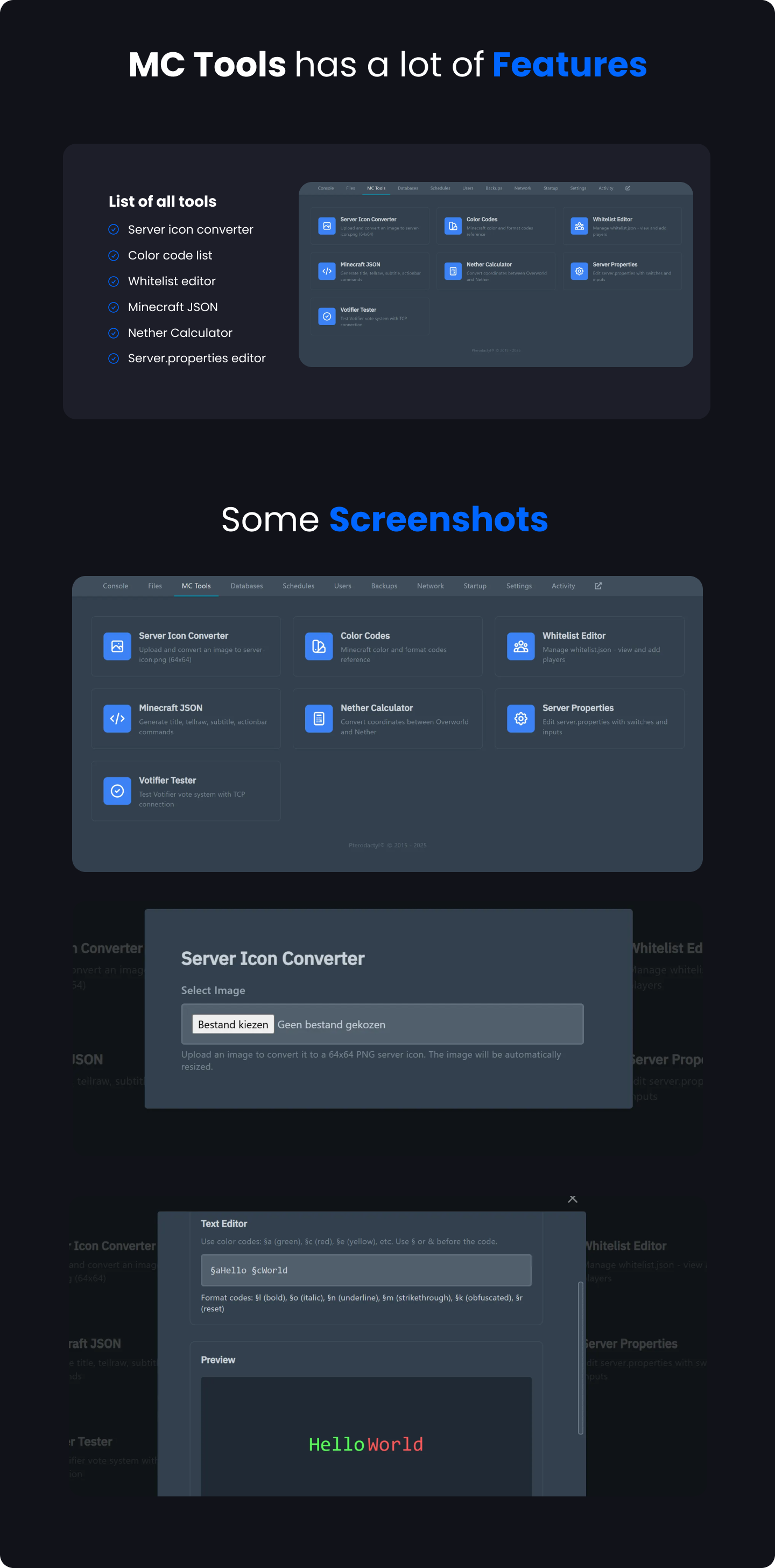 Contains tools for converting server icons, managing whitelist, editing server properties, and more