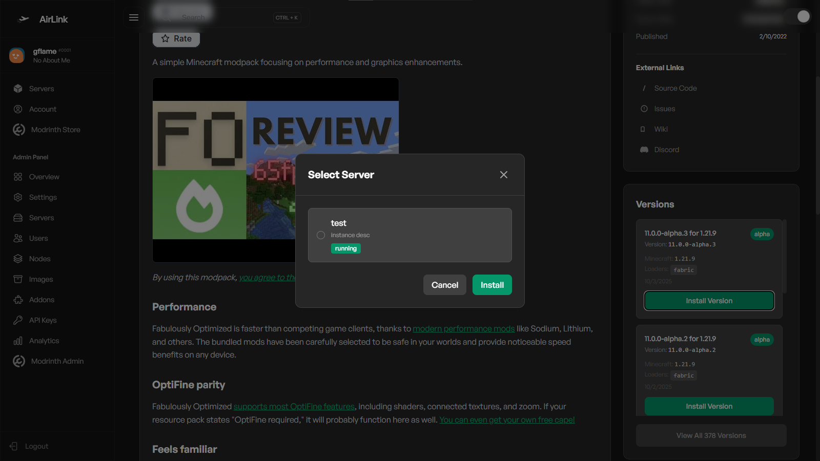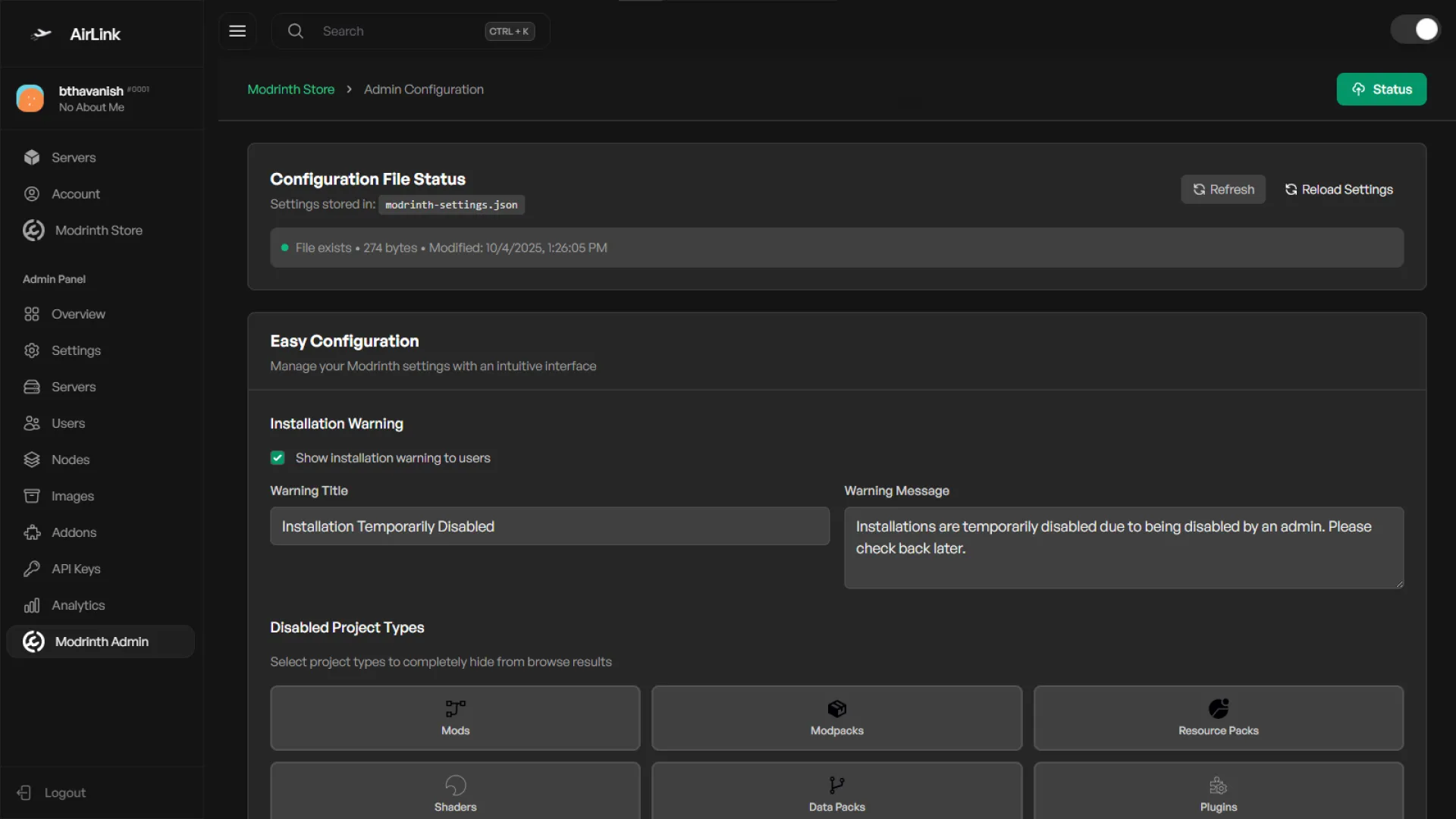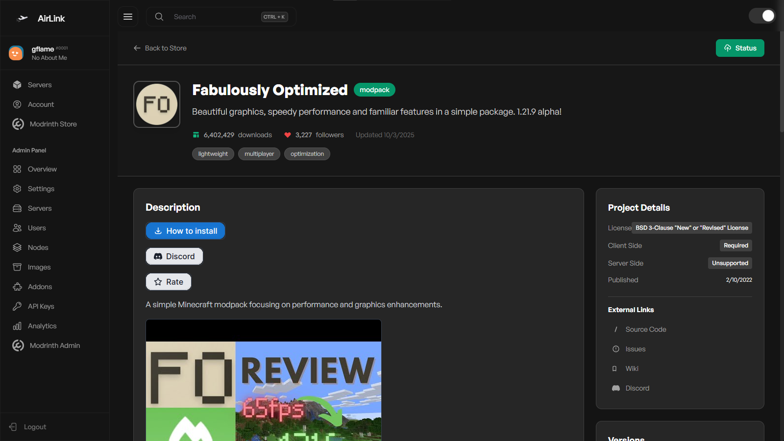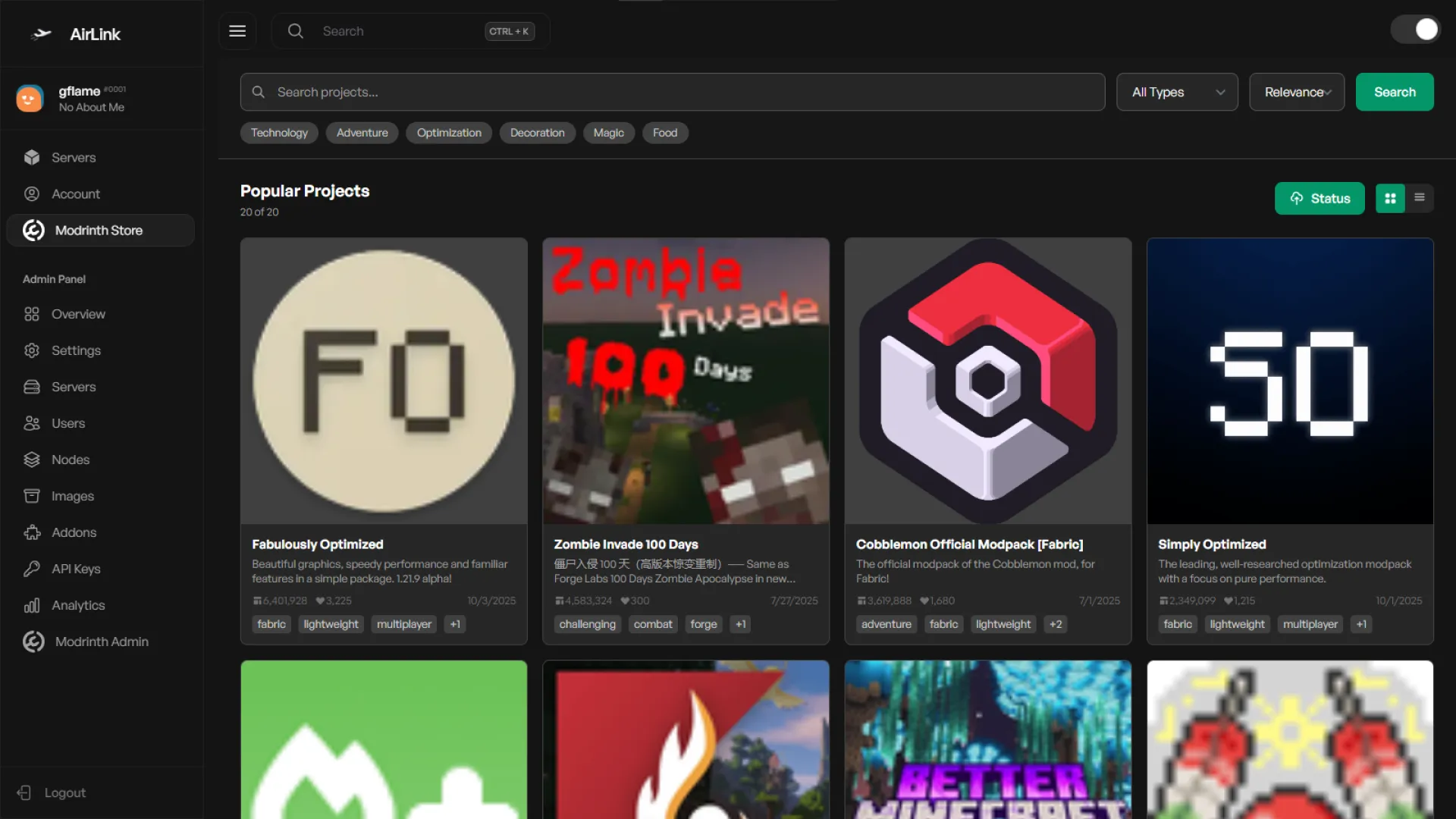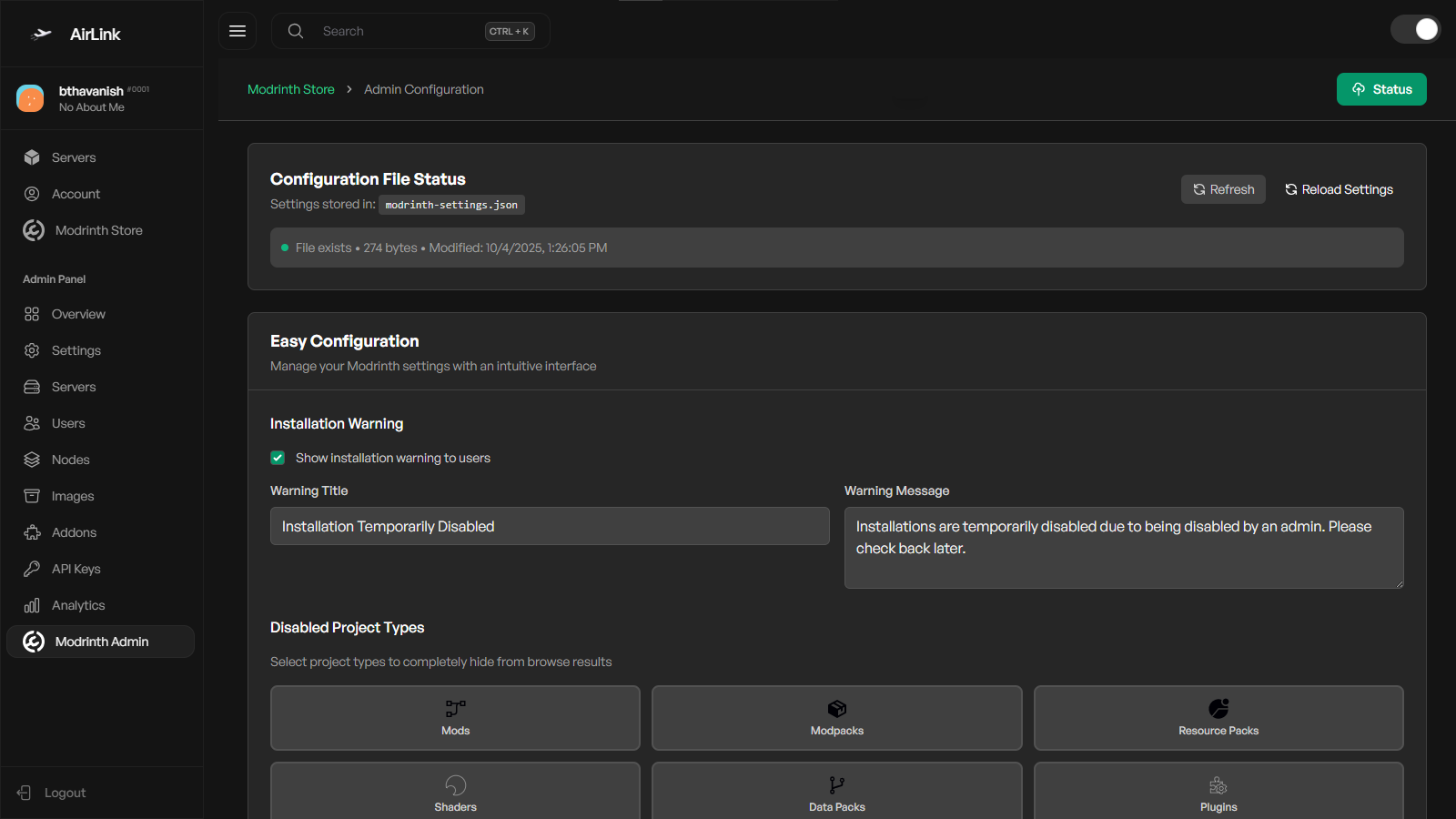 The Modrinth Store Addon integrates Modrinth directly into your Airlink panel. You can browse, search, and install mods or modpacks from the admin panel with full feature control.