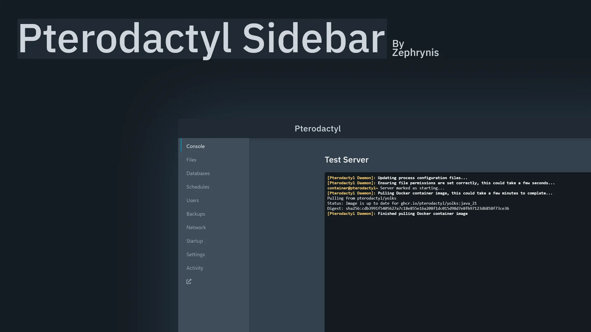 This is a pterodactyl theme made to replace the generic navigation bar with a cleaner sidebar, designed to bring a refreshing touch to the generic pterodactyl panel whilst still staying true to the original design.