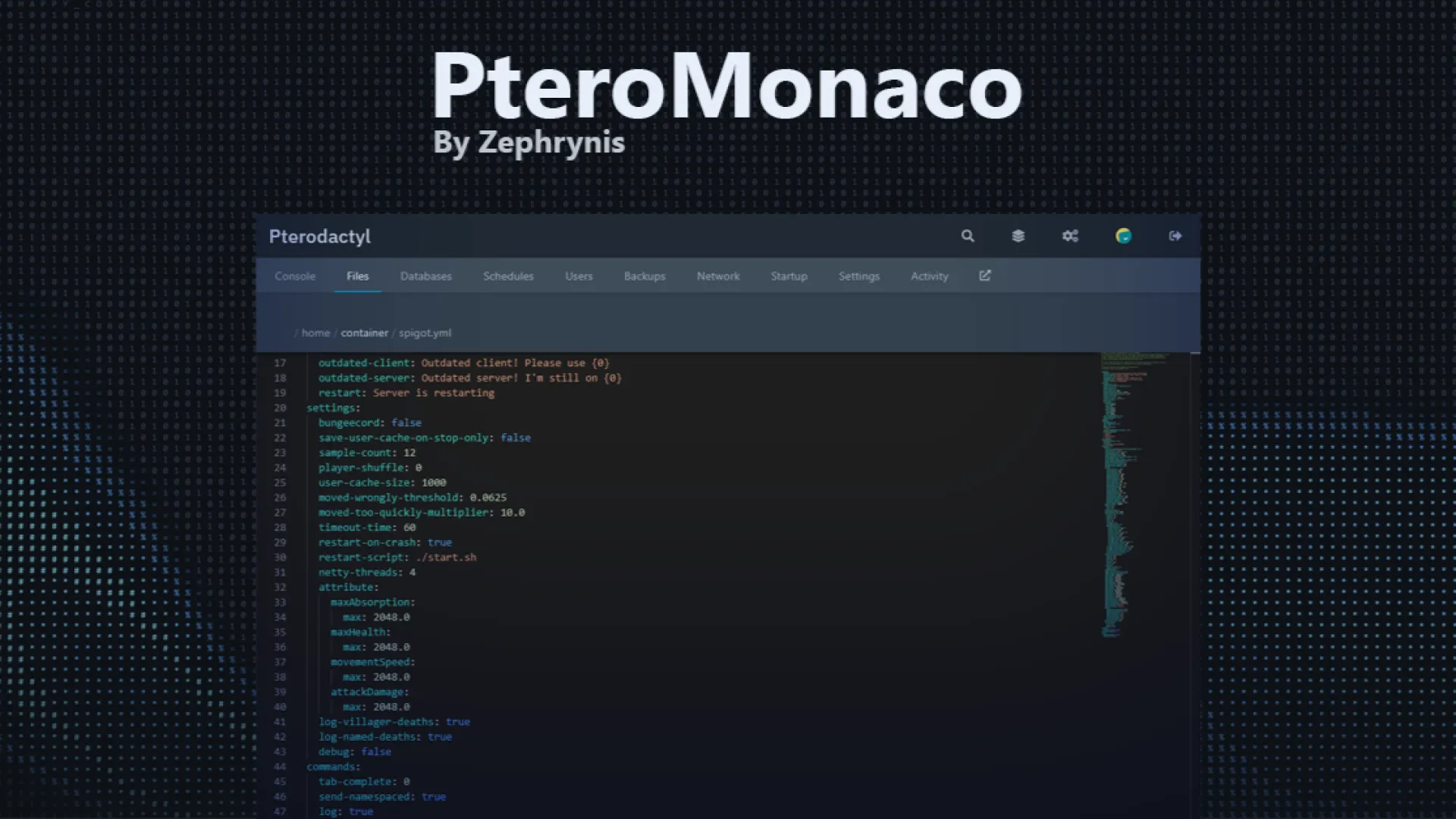 This is a pterodactyl theme made to replace the generic code editor with Monaco, a code editor with a larger featureset best known for its' use in Visual Studio Code.