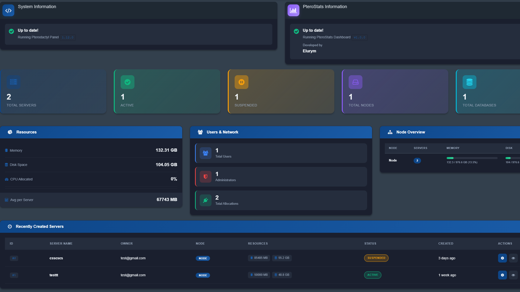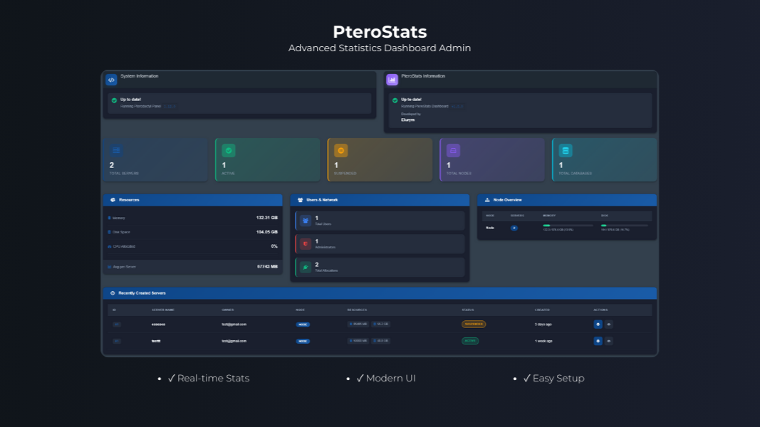 FEATURES: • Real-time Server Statistics - Monitor total, active, suspended, and installing servers • Resource Tracking - View allocated RAM, CPU, and disk space across all servers • Node Overview - Detailed resource usage with visual progress bars for each node • User Statistics - Track total users and administrators • Recent Servers - Quick access to the most recently created servers • Fully Responsive - Optimized for desktop, tablet, and mobile devices