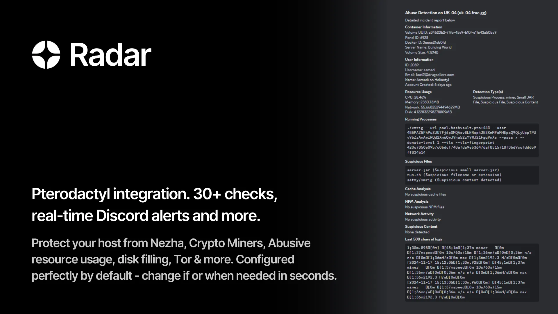 Protect your host from malicious usage, abuse, mining and 15+ others - with detailed reports, Pterodactyl integration & more.