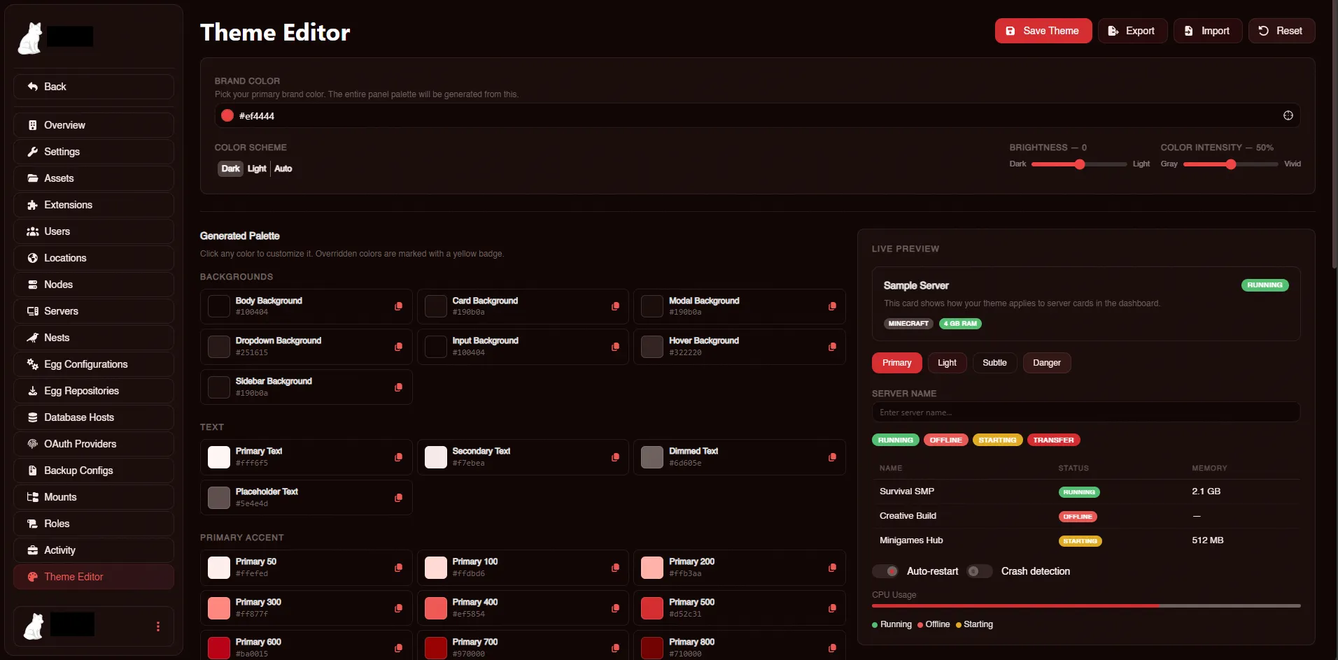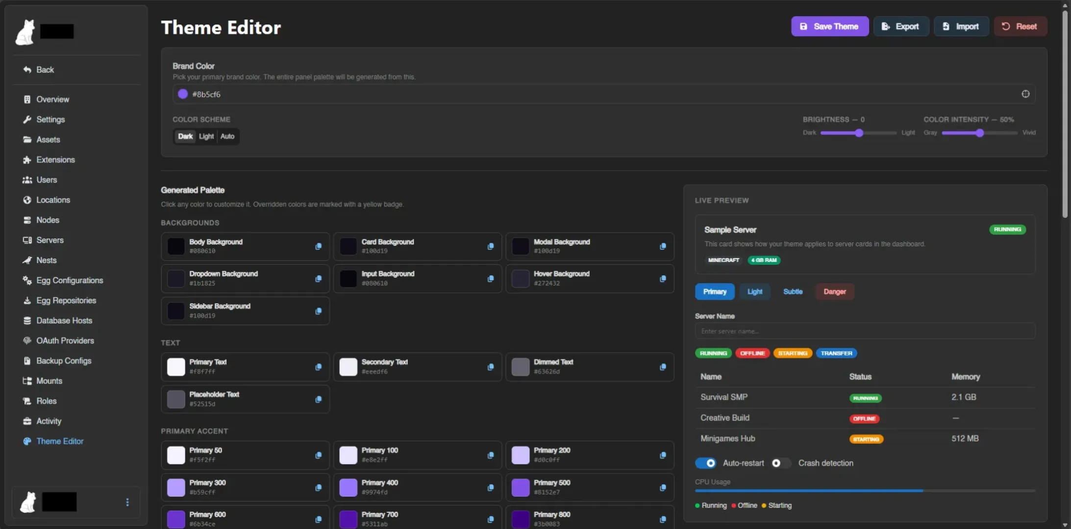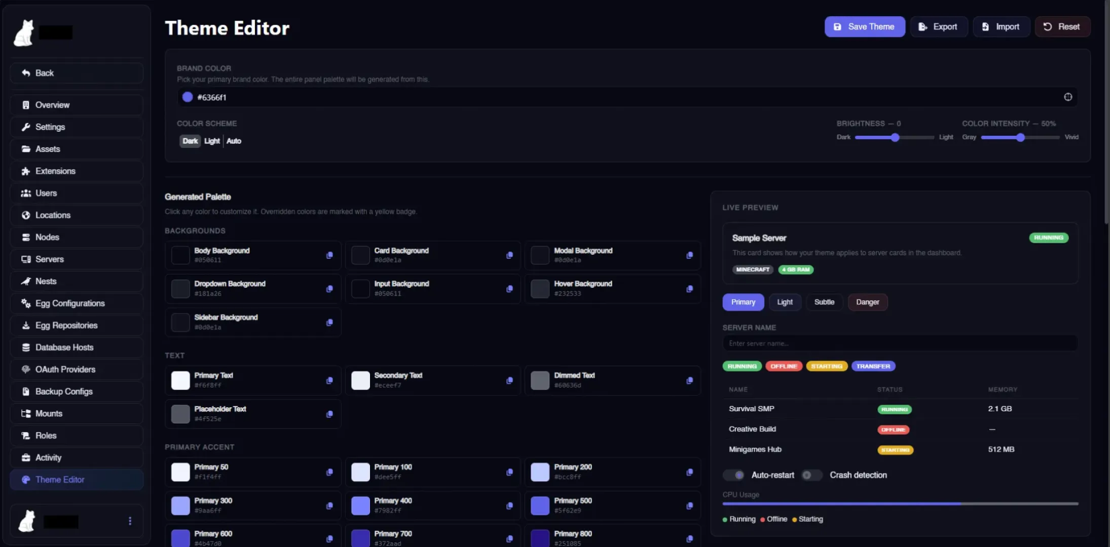 Pick a single brand color and instantly generate a complete panel theme. Supports dark and light mode with adjustable brightness and color intensity, live preview, per-color overrides, and JSON import/export.