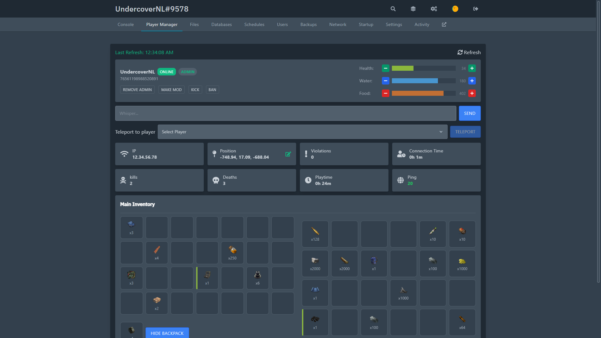You can easily manage and view player health, hydration and nutrition, admin, mod, kick, ban an unban people, but also TP or whisper, you can see their entire inventory, backpack and armor content, and remove specific items.