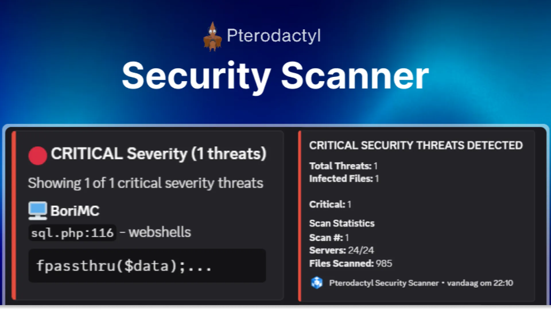 Continuously monitors all Pterodactyl-managed servers via API integration Scans server files using configurable patterns and file types Supports whitelist/blacklist filtering for targeted scanning Configurable scan intervals (default: 1 hour)
