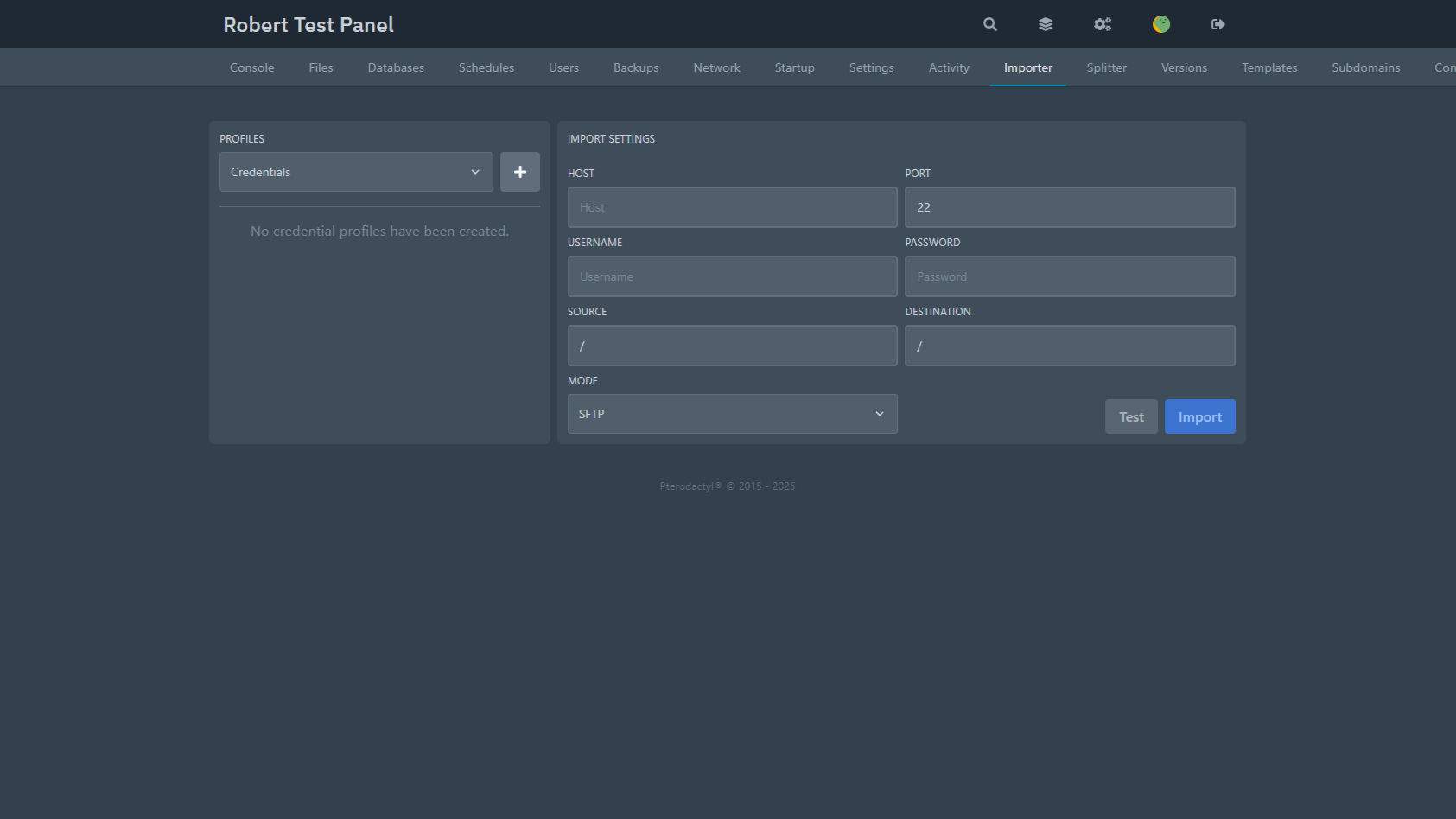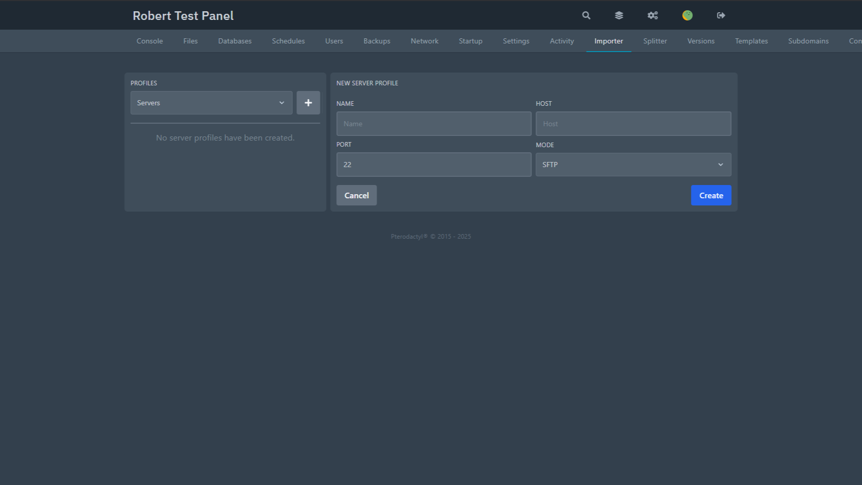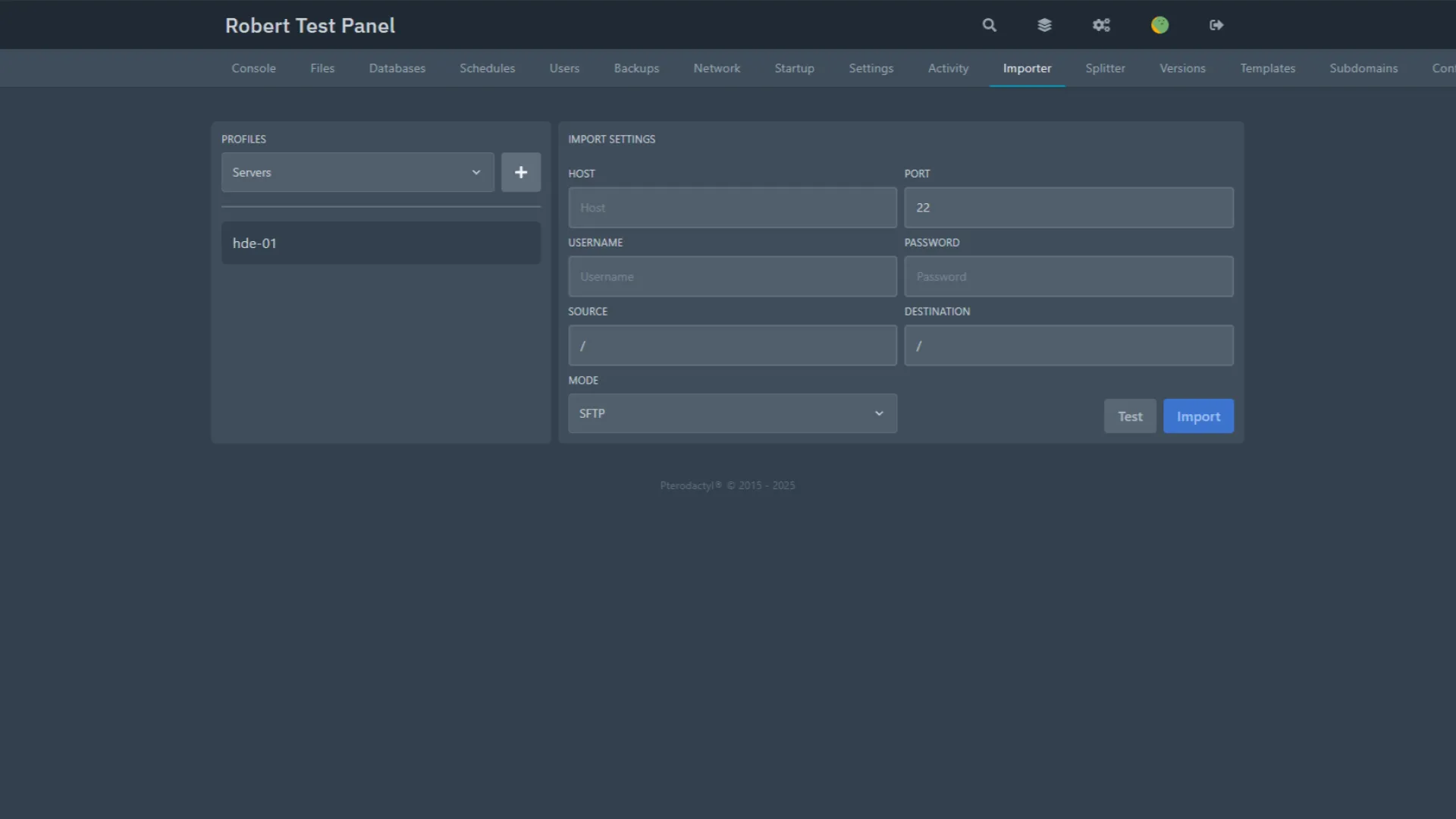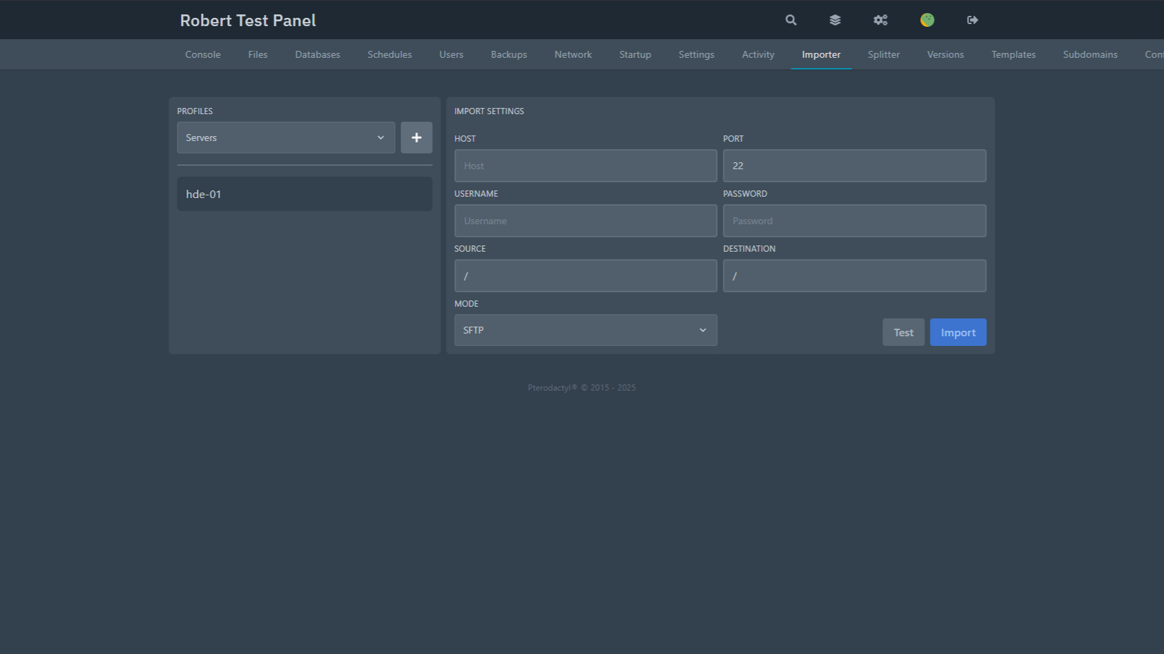This extension allows importing into your pterodactyl server from any remote FTP/SFTP Server, it uses a custom egg for imports so no wings modifications are required, this also means the server will be in a "Installing" State while importing.