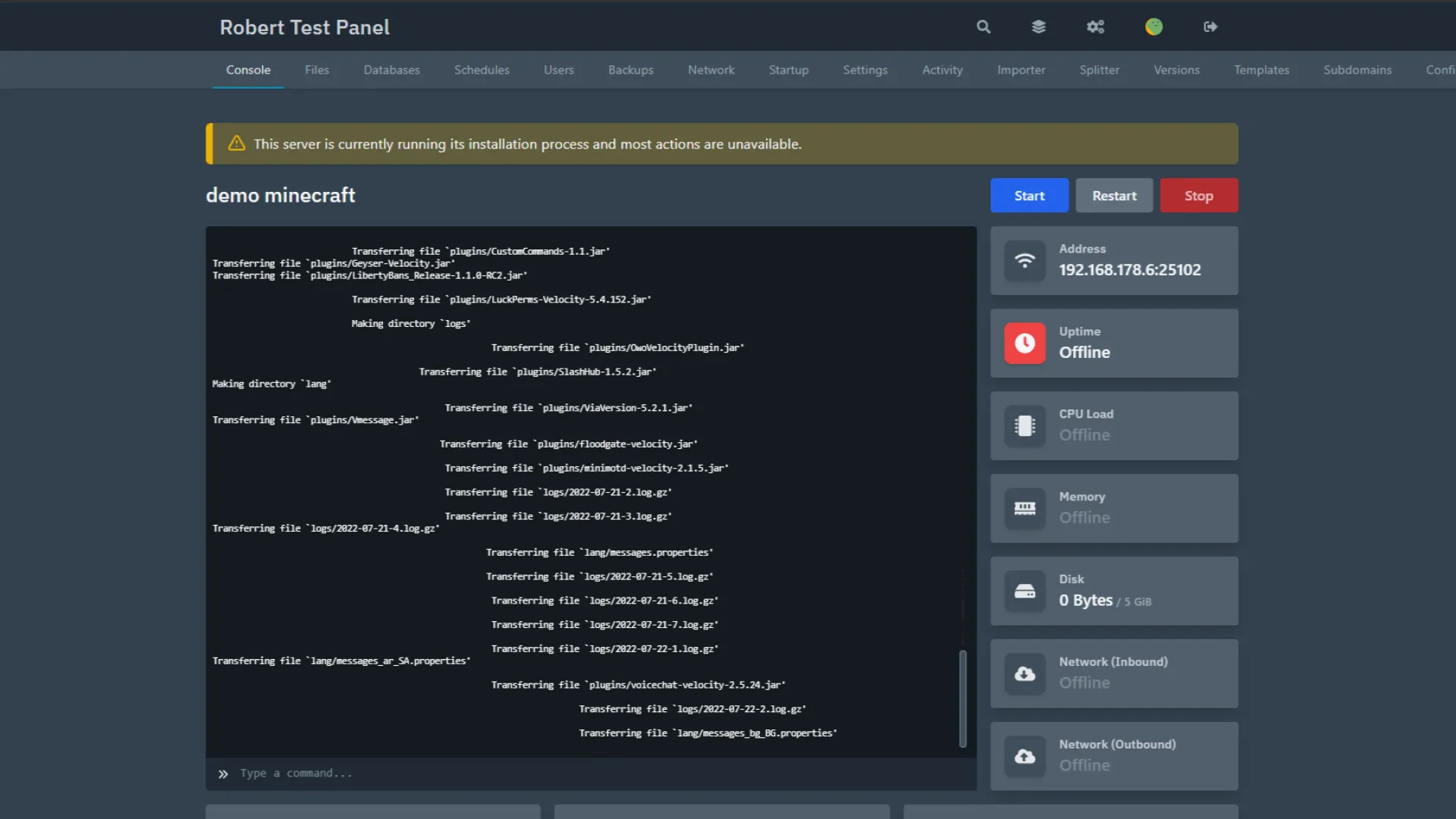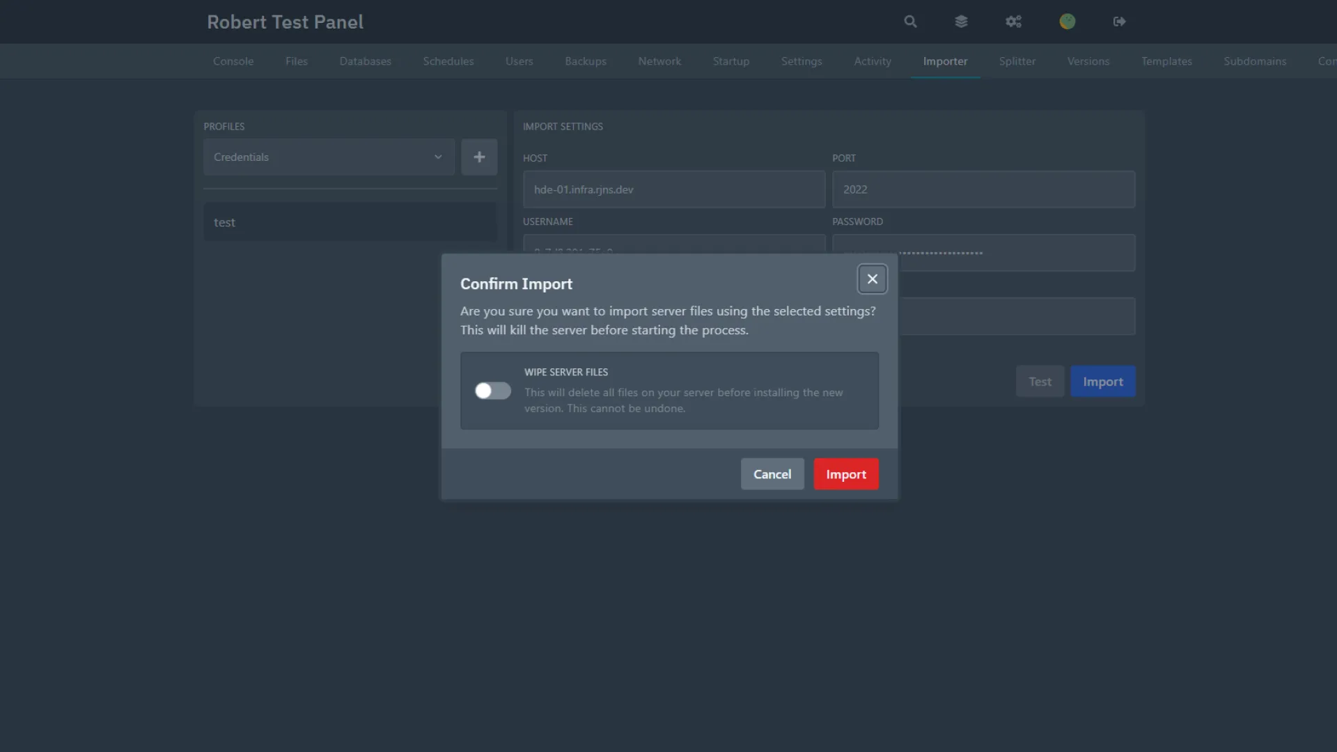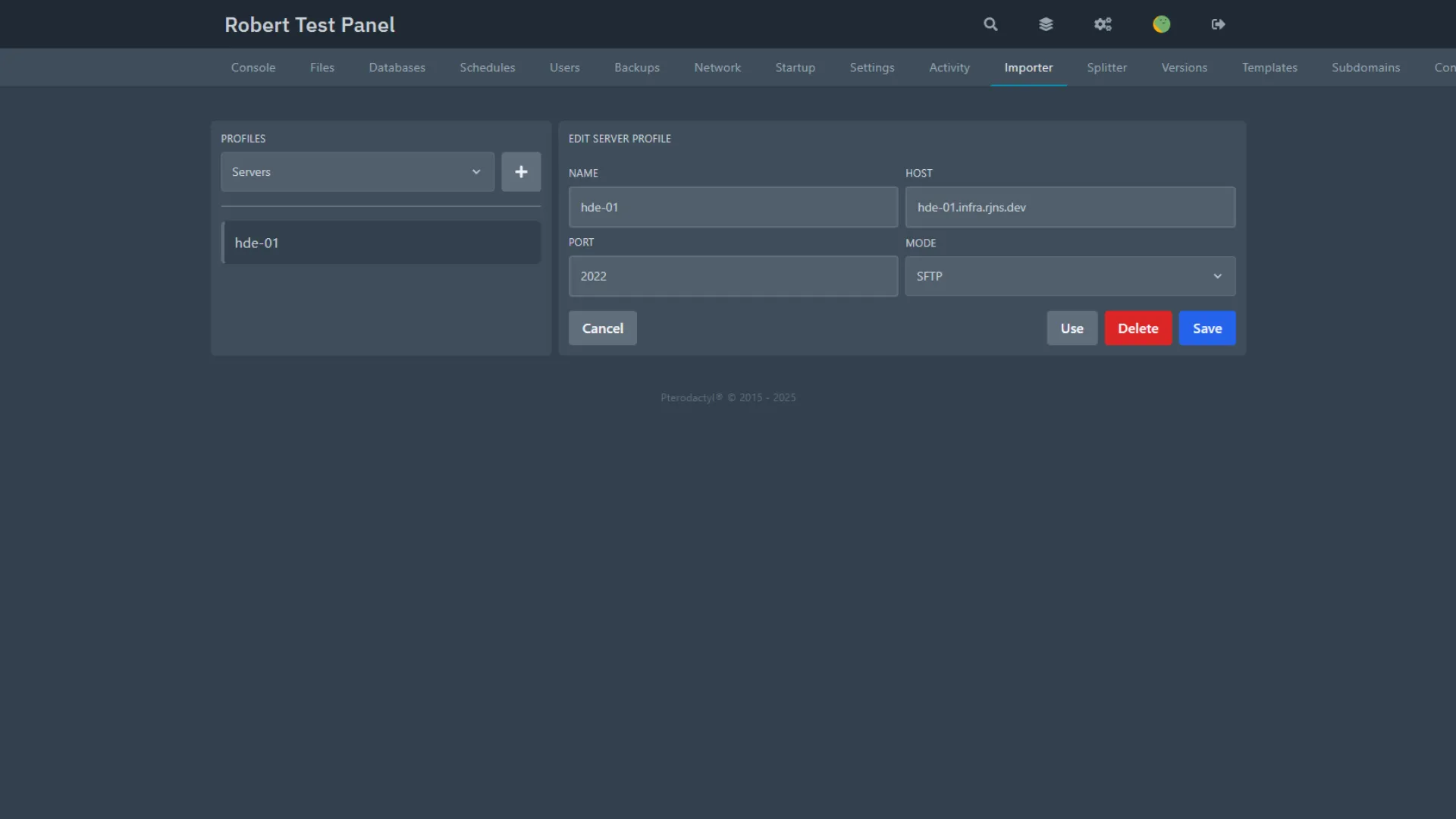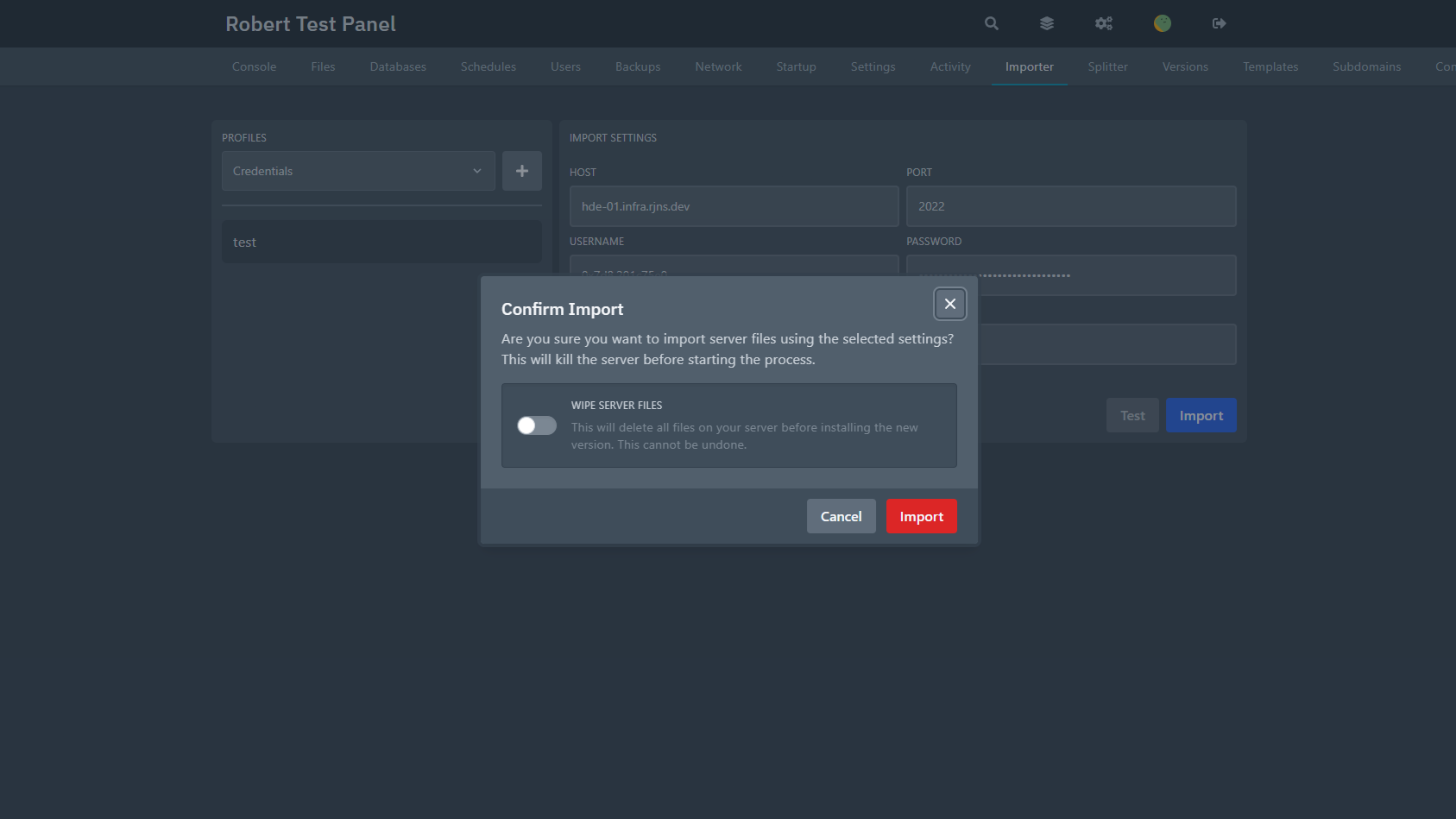 This extension allows importing into your pterodactyl server from any remote FTP/SFTP Server, it uses a custom egg for imports so no wings modifications are required, this also means the server will be in a "Installing" State while importing.