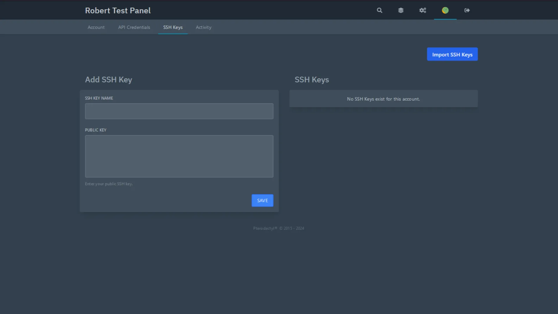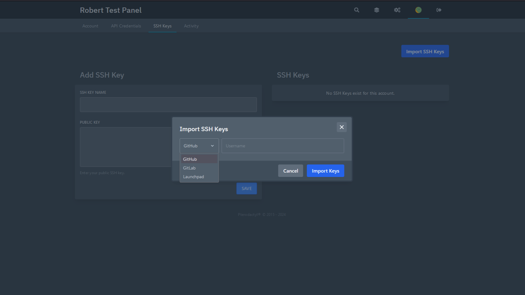This extension adds the ability to import SSH keys into your Pterodactyl panel account from GitHub, GitLab and Launchpad.
