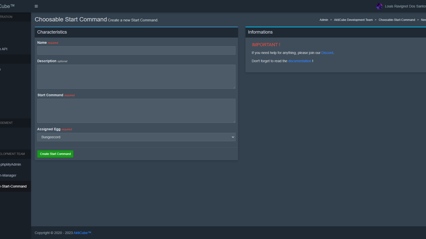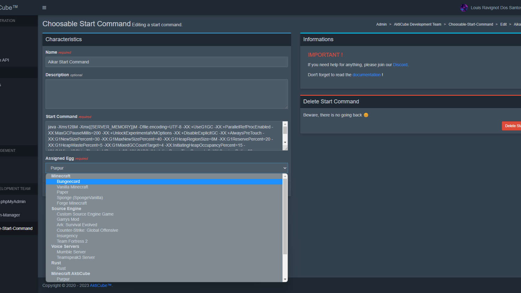 - The user will only see the commands corresponding to the ones attributed to the egg of their server