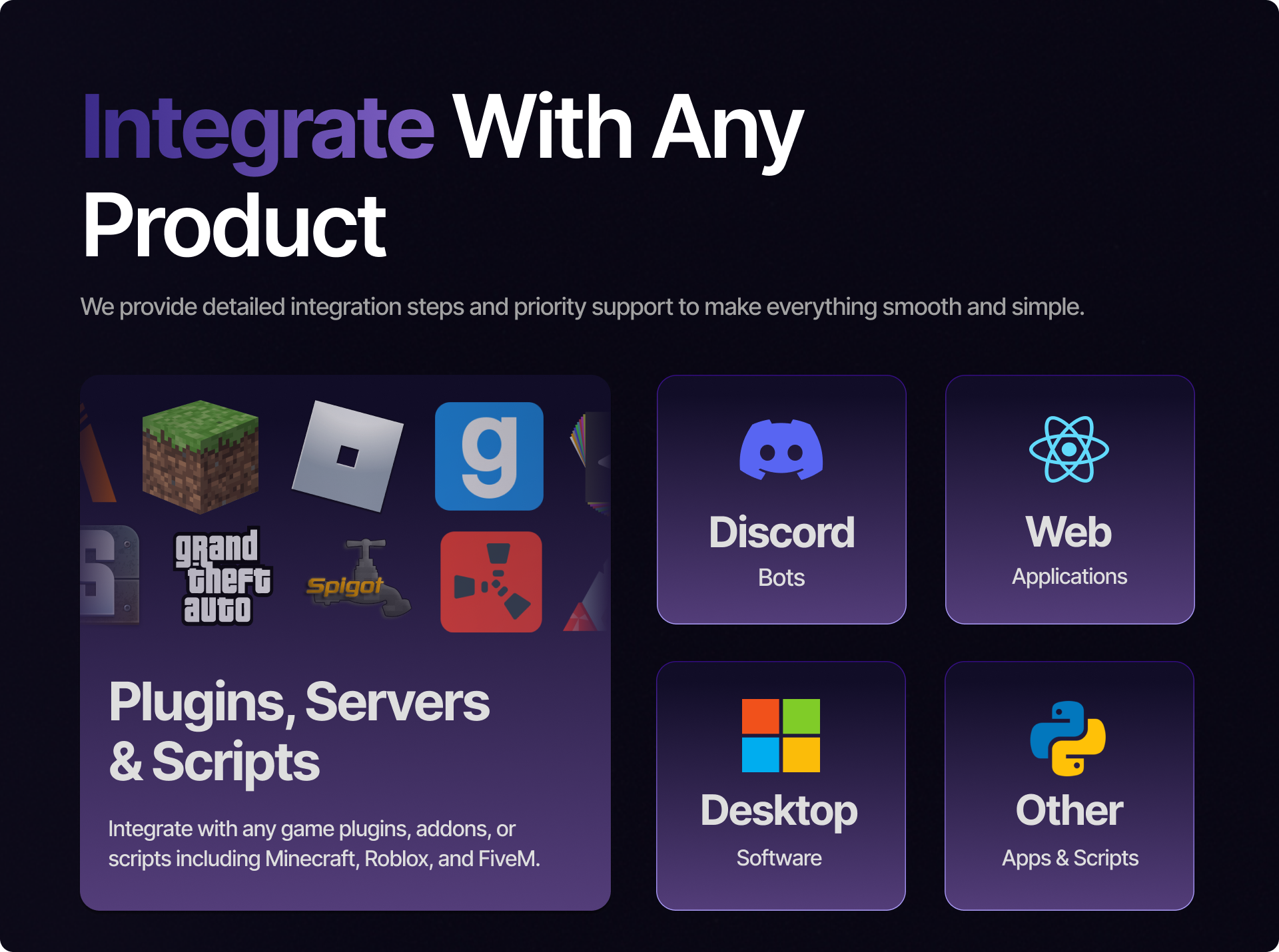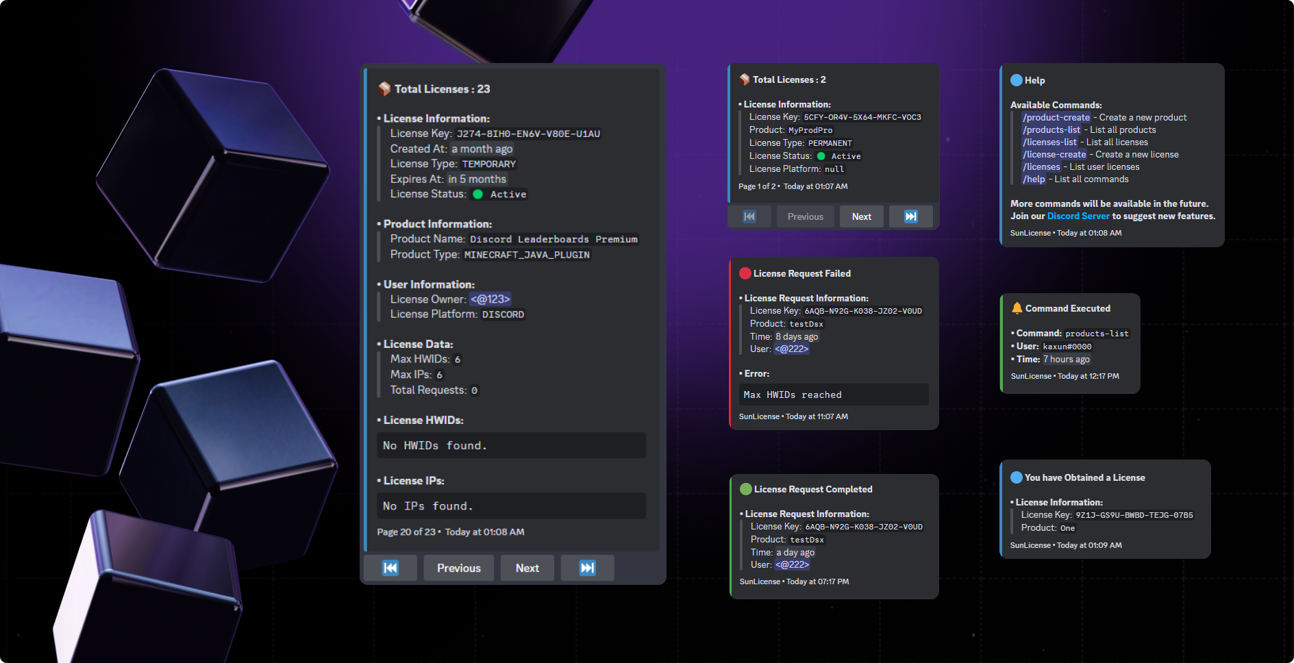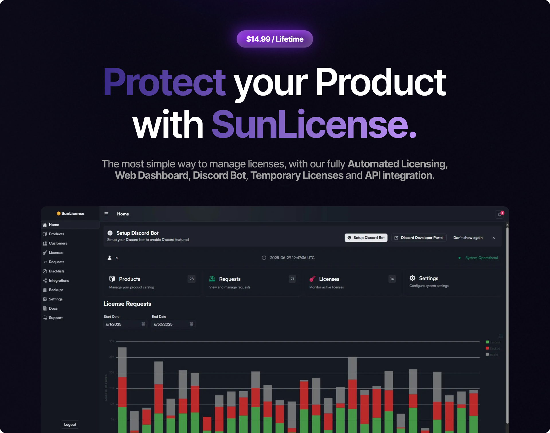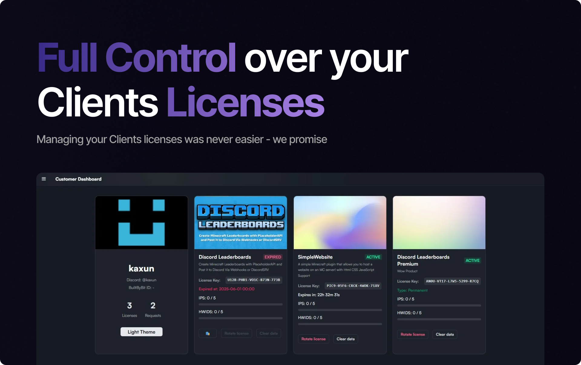 Effortlessly manage licenses with our Web Dashboard, Discord Bot, real-time Statistics, Temporary Licenses
