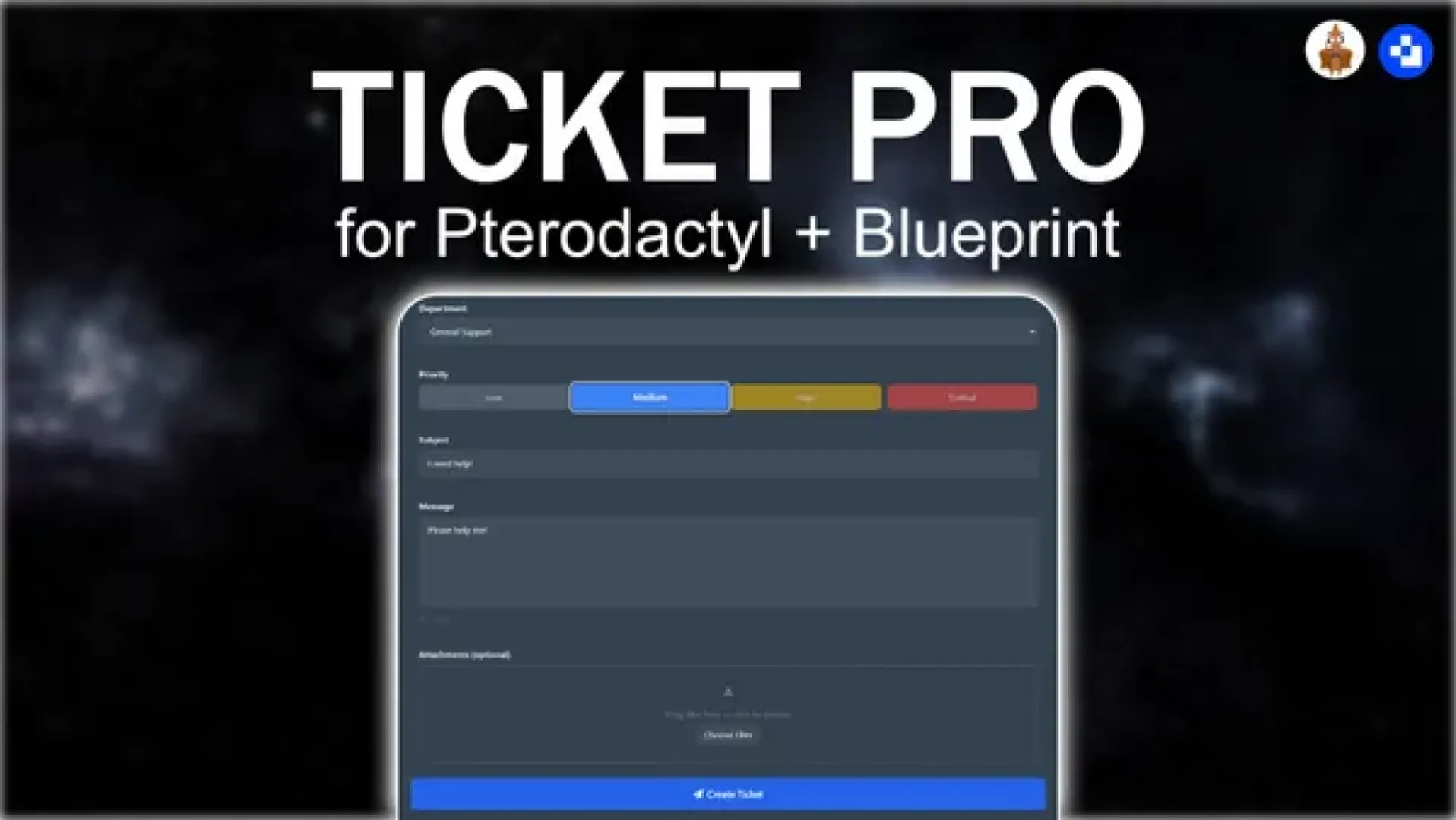 With TicketPro for Pterodactyl Blueprint, you can offer your users a comprehensive ticket system. Your users create a ticket and you immediately receive a notification about a new ticket via Discord Webhook. The same applies to admin replies and user replies. Everything can be configured however you want.