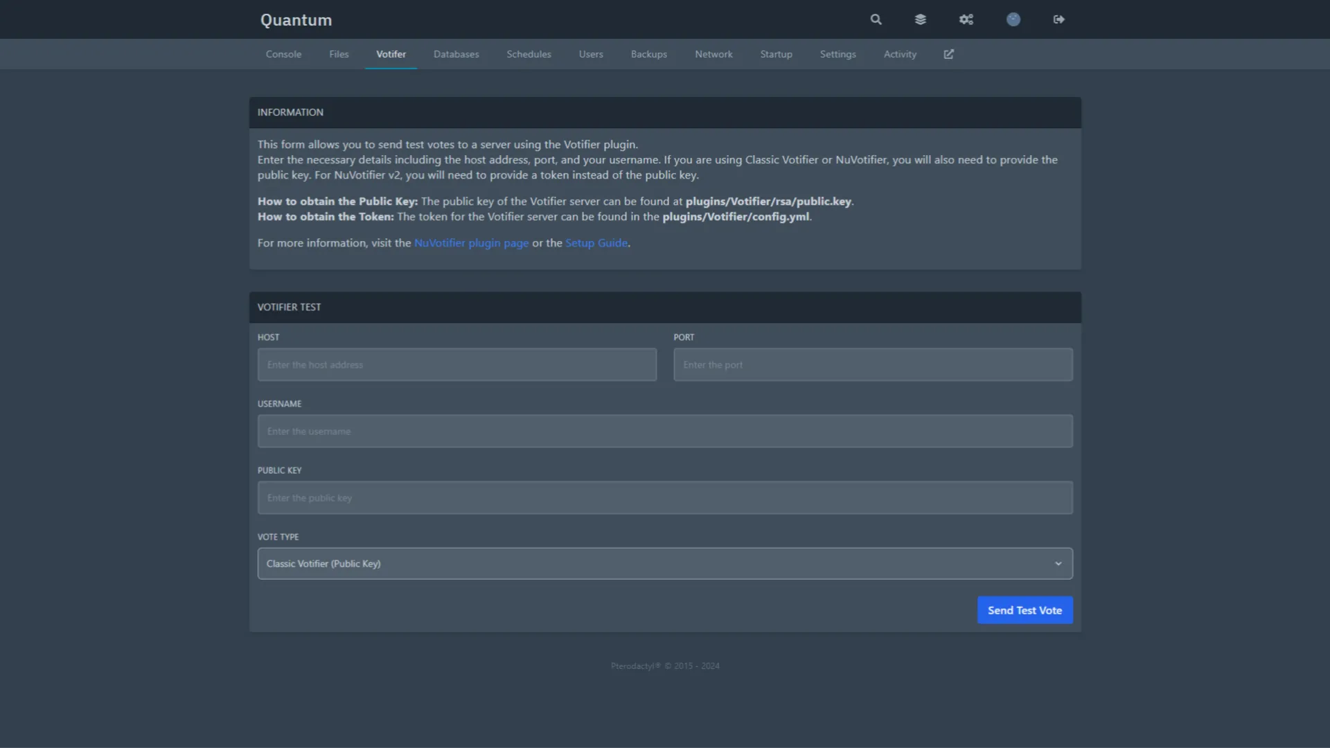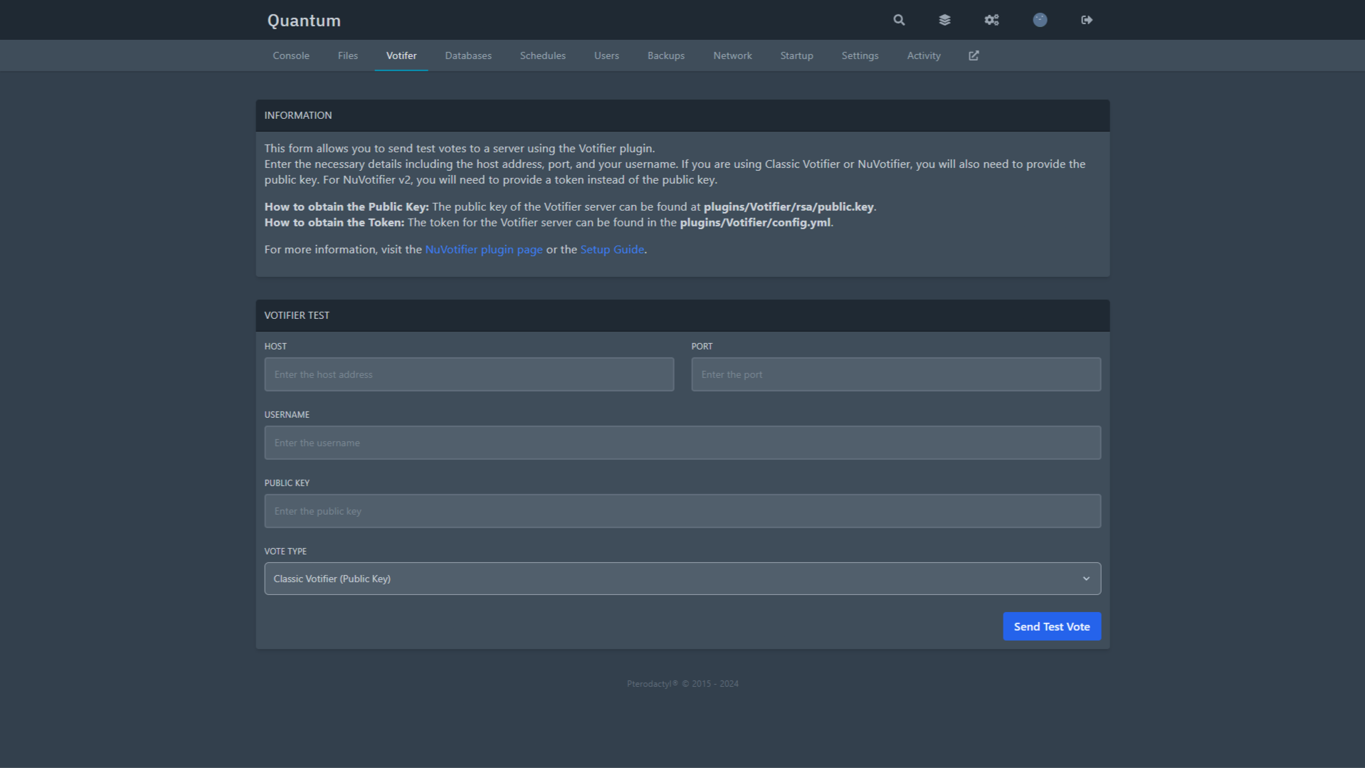 This form allows you to send test votes to a server using the Votifier plugin.