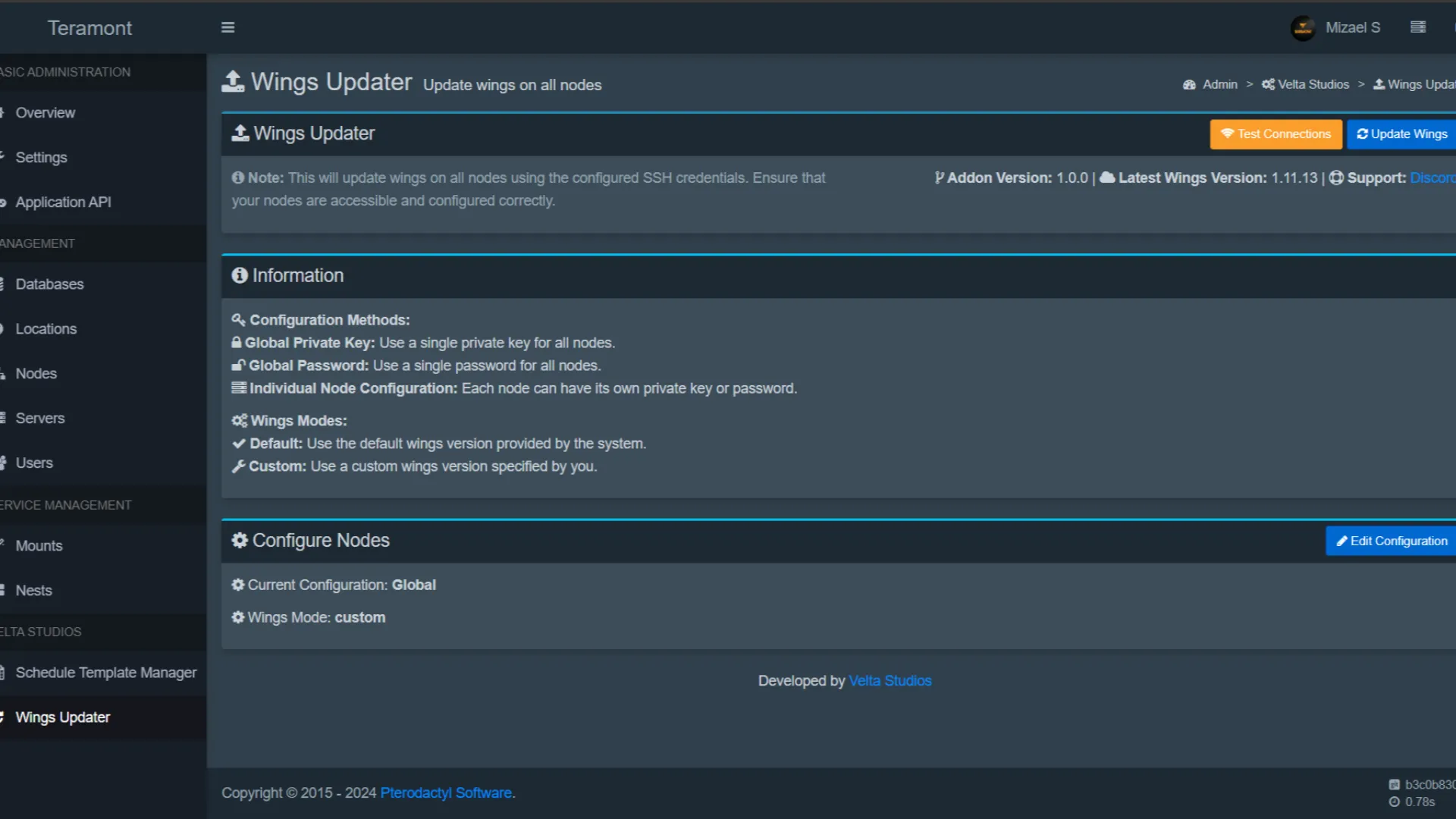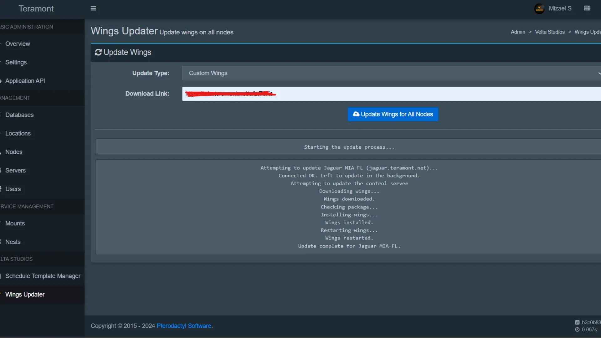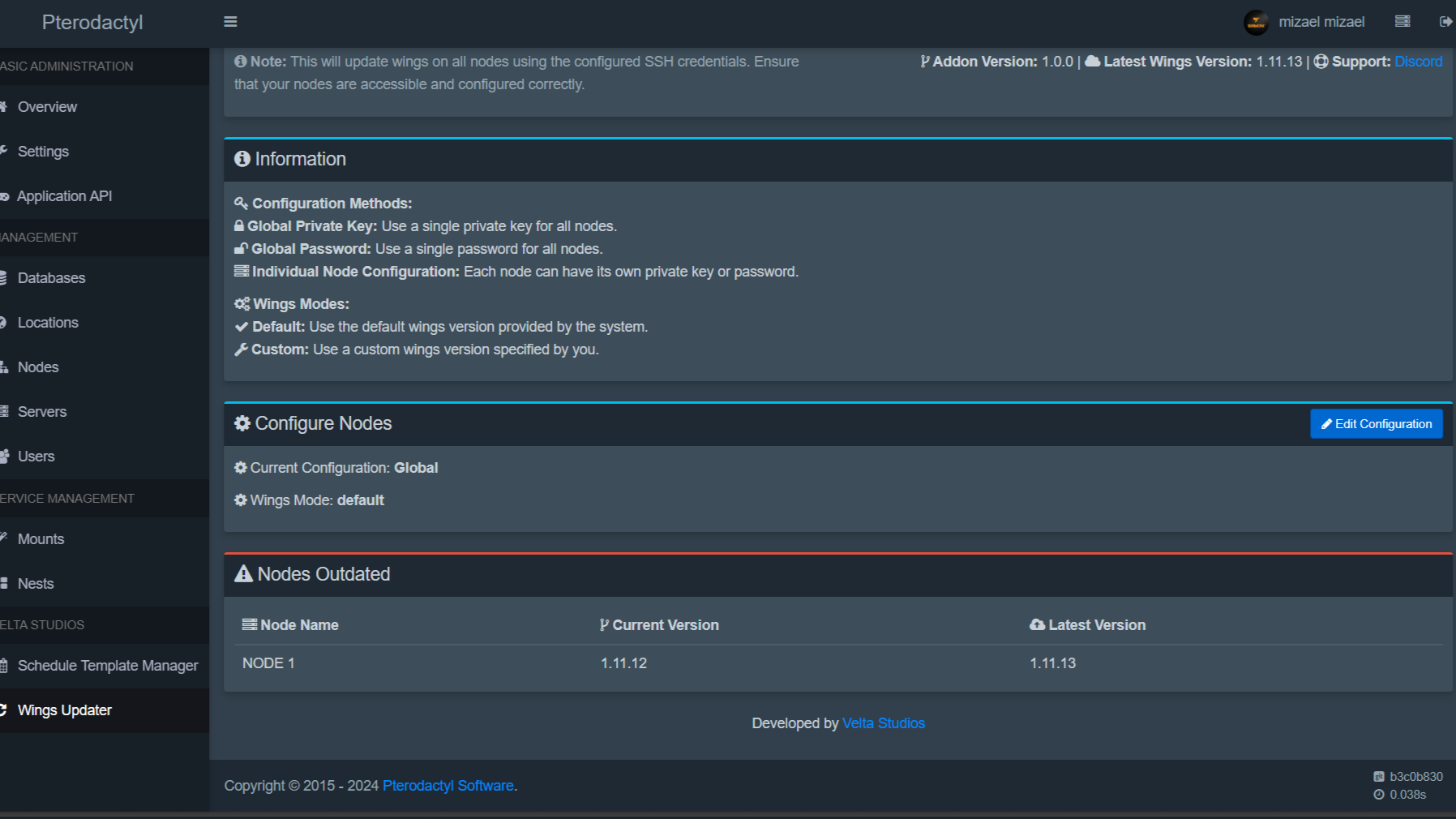 Effortlessly update Wings on all nodes in Pterodactyl from the admin dashboard, saving time and ensuring all nodes run the latest version. Ideal for managing multiple nodes.